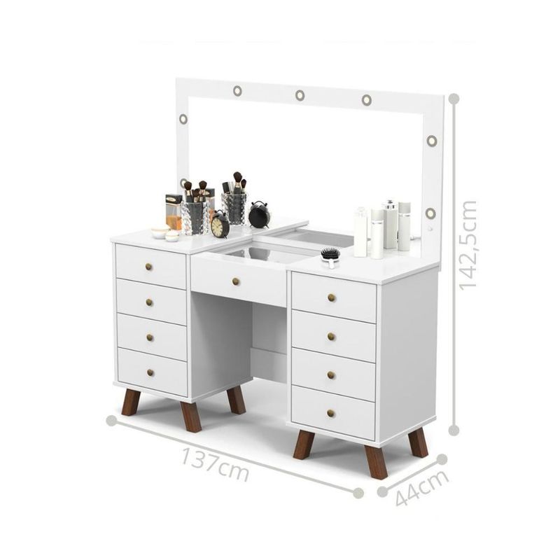 Essa Penteadeira é tudo o que você precisa para se arrumar com estilo, elegância e conforto. Proporcionando organização e facilidade para o seu momento de beleza.Feito em MDF. Contém 9 gavetas, espelho e suporte para soquetes (lâmpada). Não acompanha lâmpada.Descrição do produto:Altura: 142,5 cmLargura: 137 cmProfundidade: 44 cmInformações do produto:Cor: Off WhiteGavetas: Sim (5)Espelho: Sim (1)Material: MDFItens inclusos:01Penteadeira Camarim com Banqueta.Kit completo para montagem, manual detalhado de instruções para montagem.Garantia:3 meses contra de fabricação.Informações complementares:- Fotos meramente ilustrativas do produto no ambiente.- Os objetos que ambientam as fotos não acompanham o produto;- Verificar descrição e tamanho do produto antes da compra.- Avaliar a mercadoria no ato do e recusar em caso de divergência ou danos.- Mantenha as informações de e de atualizados para entrarmos em caso necessário.- Limpar com flanela ou pano macio seco, não utilizar produtos abrasivos, desengordurantes, álcool ou solvente. Não expor o produto diretamente à luz solar e à umidade.* Sugerimos a contratação de um montador para a montagem do produto. Não nos responsabilizamos por danos causados no ato da montagem.* Não nos responsabilizamos pela montagem e desmontagem do produto no ato da e , assim como os custos gerados nestas situações.* A transportadora entregará o produto no andar térreo do de .* Não nos responsabilizamos por subir escadas, corredores e elevadores ou por guincho em apartamentos. Requer montagem: Sim | Inclui manual de montagem: Sim | Quantidade de caixas de embalagem: 2 | Comprimento: 44 | Profundidade: 44 | Altura: 142,5 | Largura: 137 | INSTRUÇÕES/CUIDADOS: Limpar com flanela ou pano macio seco, não utilizar produtos abrasivos | PRODUTO PRECISA DE MONTAGEM?: SIM | PRODUTO: PENTEADEIRA | QUANTIDADES DE CAIXAS DE EMBALAGEM: 2 | POSSUI ILUMINAÇÃO: NÃO | ALTURA DO PRODUTO (CM): 142,5 | LARGURA DO PRODUTO (CM): 137 | COMPRIMENTO DO PRODUTO (CM): 44 | MATERIAL PRINCIPAL: MDF | PESO DO PRODUTO (KG): 65,85 | POSSUI BANQUETA: NÃO | POSSUI GAVETAS: SIM | ALTURA DO PRODUTO COM EMBALAGEM (CM): 24 | LARGURA PRODUTO COM EMBALAGEM (CM): 137,5 | COMPRIMENTO PRODUTO COM EMBALAGEM (CM): 71 | PESO PRODUTO COM EMBALAGEM (KG): 69,1 | DESCRIÇÃO DO TAMANHO: 142,5X137X44 | CORES DO PRODUTO (FILTRO DE CORES): BRANCO | MATERIAL PARA FILTRO: MDF | COR PREDOMINANTE: BRANCO | ESTADO DE ORIGEM: SP | CONTEÚDO DA EMBALAGEM: 1 PENTEADEIRA