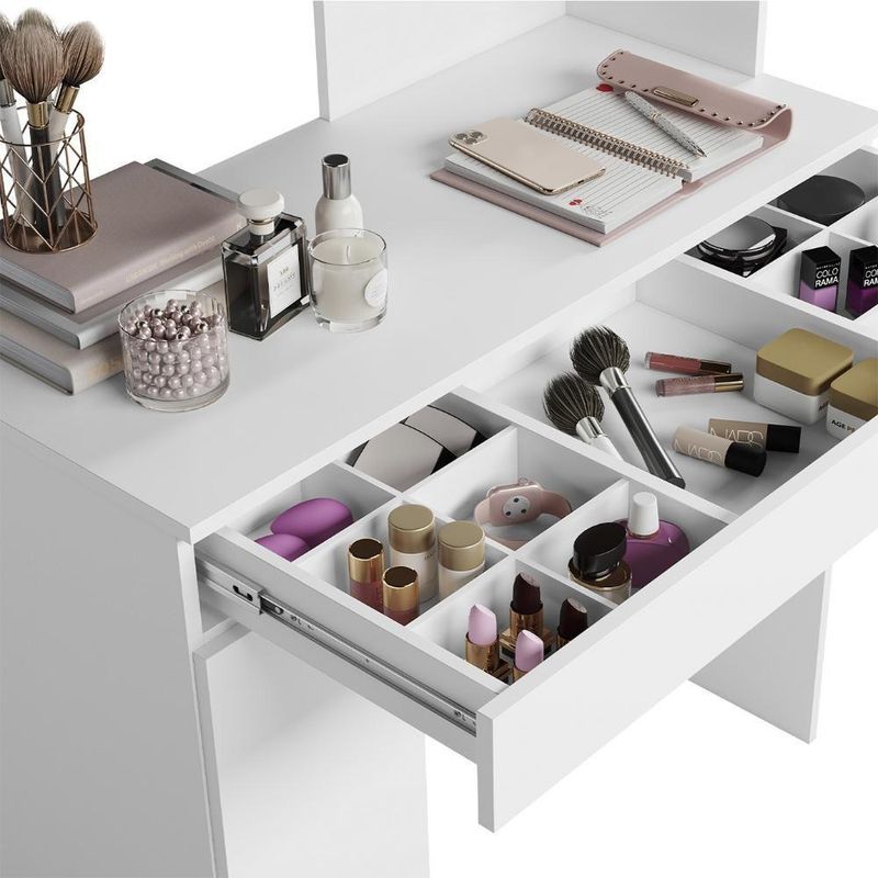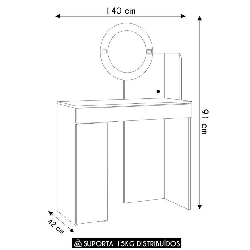 Com Design Moderno e elegante, ela conta com uma gaveta equipada com corrediças telescópicas, proporcionando maior suavidade e durabilidade no deslizamento, ideal para armazenar itens de maquiagem e acessórios. Além disso, a peça possui uma porta convencional com dobradiças metálicas, que garantem resistência e facilidade de uso, oferecendo um espaço extra para armazenar produtos de forma organizada. Para atender às necessidades de quem ama se arrumar com detalhes de bom gosto, a Penteadeira conta com duas luminárias de LED, que oferecem uma iluminação suave e eficiente, ideal para realizar maquiagem e cuidados com a pele. As luminárias têm um design sofisticado, sendo integradas à estrutura do móvel e proporcionando um toque de glamour ao ambiente. A estrutura da Penteadeira Camarim é fabricada em MDP com pintura UV, garantindo um acabamento resistente, além de conferir um aspecto moderno e sofisticado. As divisórias organizacionais internas são um diferencial, permitindo a separação eficiente dos itens, mantendo tudo no lugar e facilitando o acesso. A combinação de funcionalidade e design torna essa penteadeira camarim a escolha ideal para quem deseja um Quarto prático e bem organizado.