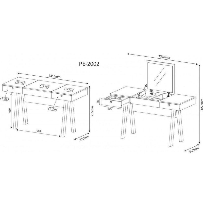- Dimensões do Produto (LxAxP): Penteadeira: 131,5 X 75,5 x 52cm