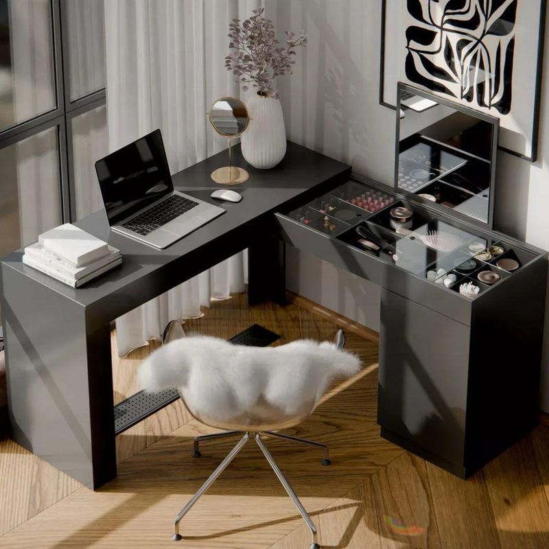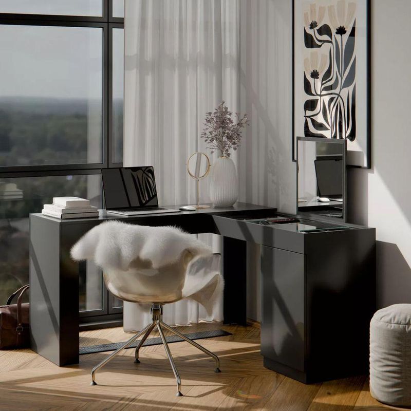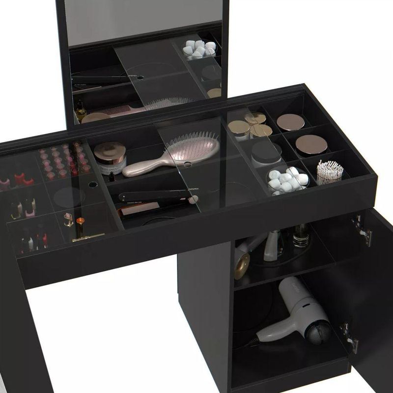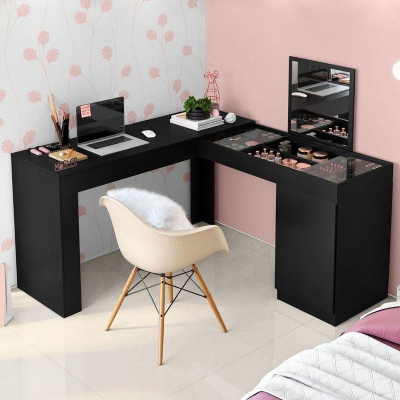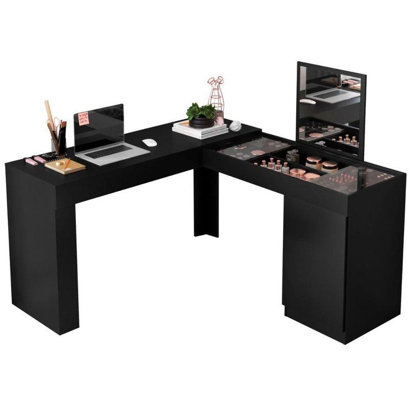 Penteadeira Escrivaninha Em L Com Espelho 1 Porta Isis Cor:preto