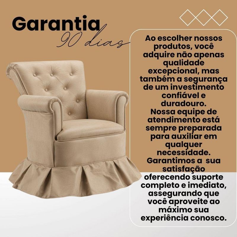 Poltrona Estofada com Capitonê – Conforto e Elegância para seu AmbienteEsta poltrona estofada é a escolha ideal para quem busca conforto, sofisticação e um design atemporal. Com encosto levemente inclinado e acabamento em capitonê, ela agrega charme e requinte à decoração, tornando-se um destaque no ambiente sem perder a versatilidade.O assento amplo e macio proporciona excelente conforto para o uso diário, enquanto os braços estofados oferecem apoio ergonômico e acolhedor. Sua estrutura firme garante estabilidade e durabilidade, ideal tanto para uso residencial quanto comercial.O detalhe da saia na base confere um toque clássico e elegante, valorizando o acabamento e reforçando o visual sofisticado da peça. Perfeita para salas de estar, quartos, recepções, escritórios, consultórios ou espaços de leitura.ESPECIFICAÇÕES:Estrutura em madeira pinus e eucalipto, resistente e durável.Assento revestido em Suede de alta qualidade.Design moderno, minimalista e fácil de combinar.Ideal para sala, quartos e espaçoes de leitura.DIMENSÕES:Altura: 90 cmAltura do chão ao assento: 44 cmLargura: 72 cmLargura do assento: 47 cmProfundidade: 68 cmProfundidade do assento: 53 cmPeso: 20 KgPeso Suportado: 110 KgEspuma: Assento D-21Espuma: Encosto D-12Espuma: Braça D-21MOTAGEM- Produto vai montado.GARANTIA DA FÁBRICACada peça passa por uma curadoria rigoRosa que assegura beleza, qualidade e durabilidade. Ainda assim, caso algum produto apresente defeito de fabricação dentro de 90 dias após a entrega, nosso suporte humano, atencioso e altamente profissional estará pronto para atender você com agilidade e eficiência. Valorizamos sua confiança e estamos comprometidos em oferecer soluções rápidas que preservem sua experiência positiva com a marca. Aqui, garantir sua tranquilidade é parte do nosso padrão de excelência.CUIDADOS A LIMPEZA:Utilize um pano limpo e levemente úmido. Indicado para ambientes internos, evite exposição direta ao sol, calor excessivo e umidades.INFORMAÇÕES IMPORTANTES- Pode haver diferença entre a imagem e o produto real devido a tratamento de imagens e calibração do monitor.- Não garantimos a mesma para futuras compras devido à variação em lotes de tecido.- Não inclui objetos de decoração e eletros.- Confira as medidas para garantir que o produto passe por escadas, elevadores e portas.