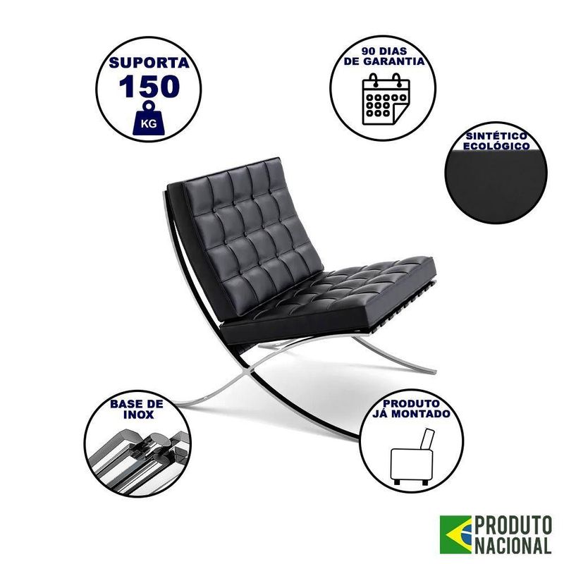 Poltrona Barcelona Couro Ecológico Base Inox Preto