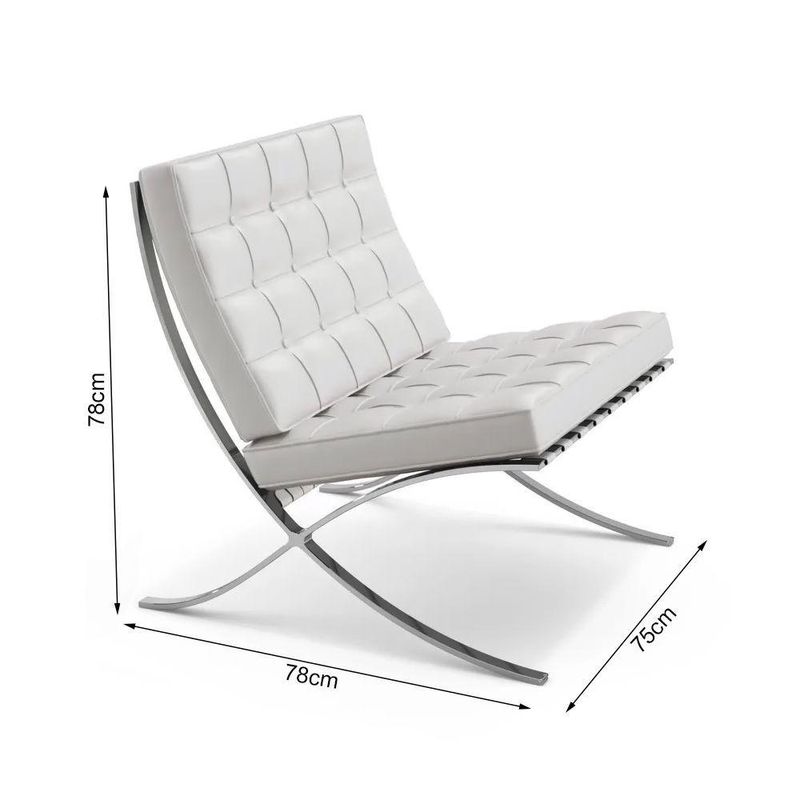 A poltrona Barcelona, além de muito estilosa e conhecida pelo seu design impecável possui uma história muito interessante. Ela foi desenhada pelo arquiteto e diretor de Bauhaus, Ludwig Mies Van der Rohe, junto com sua sócia Lilly Reich. A poltrona foi projetada visando a harmonia do design e simbolizando um trono.Ela é imponente quando usada em ambientes de trabalho como recepções e, também, traz charme e elegância para a casa. A poltrona reflete o seu ar moderno e atual até hoje, mesmo tendo sido criada há 81 anos. Atualmente, existem apenas dois modelos originais feitas pelo arquiteto que estão mantidas na Espanha, no Pavilhão Alemão.CARACTERÍSTICASTipo: PoltronaModelo: BarcelonaCor: BrancoDIMENSÕES DA POLTRONAAltura: 78cmLargura: 78cmComprimento: 75cmOBSERVAÇÃOMontagem: Necessário apenas encaixar o assento na estrutura.Limpeza: utilizar um pano macio levemente úmidoPESO SUPORTADO150 quilosGARANTIA: 90 diasATENÇÃOAS IMAGENS SÃO MERAMENTE ILUSTRATIVAS E PODEM SOFRER VARIAÇÕES DE COR E PEQUENOS DETALHES DE ACORDO COM O SEU MONITOR, ILUMINAÇÃO DO AMBIENTE E ATÉ MESMO A SUA PERCEPÇÃO VISUAL.Poltrona Barcelona Inox Couro Branco