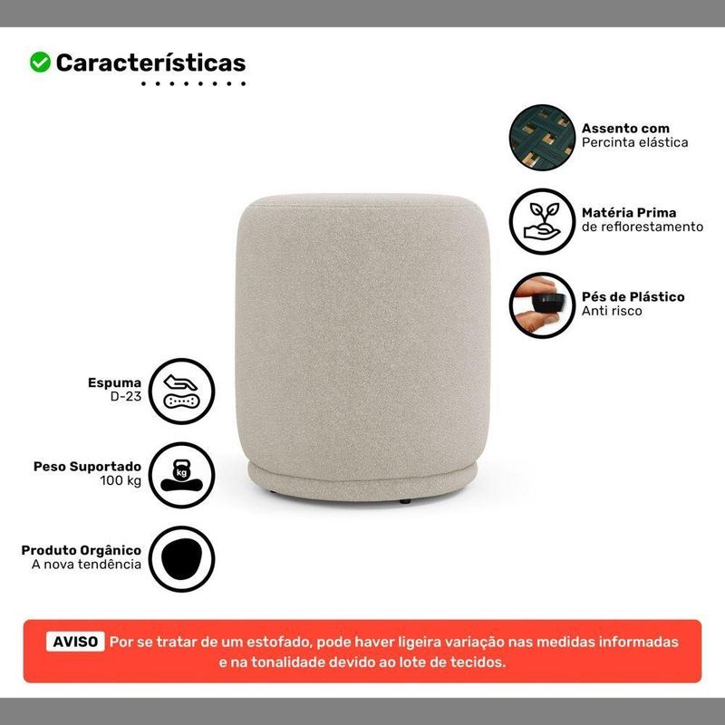 As peças são produzidas com estrutura em madeira de eucalipto e espuma D-23, oferecendo durabilidade e conforto no uso diário. O puff pode ser usado como apoio para os pés ou assento extra, agregando versatilidade e charme ao ambiente.