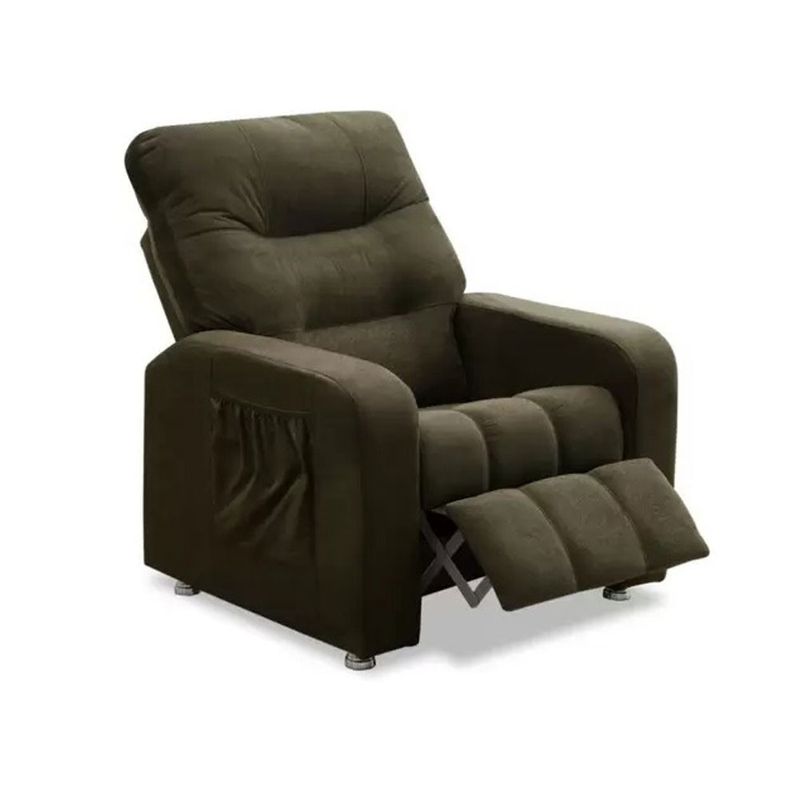 Na lateral com porta objetos. Almofada do encosto com enchimento de fibra siliconada.
