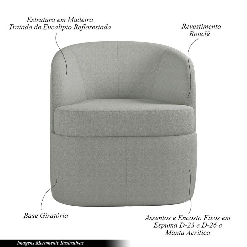 Apresentamos a Poltrona Decorativa Design Moderno Bel, uma combinação perfeita entre conforto, estilo e durabilidade. Sua estrutura é confeccionada com madeira de reflorestamento de eucalipto tratado, reforçada com cantoneiras e chapas em MDF para garantir estabilidade e resistência. O encosto e o assento são preenchidos com espuma D-26 e D-23, proporcionando um apoio confortável para momentos de relaxamento. A base giratória embutida, feita de plástico resistente de 03cm de altura, permite uma rotação suave e conveniente. Com um revestimento em Bouclê, esta poltrona adiciona um toque de sofisticação ao seu espaço. Com capacidade de suportar até 120kg, é perfeita para desfrutar de conforto com tranquilidade. Renove sua sala de estar com a Poltrona Decorativa Design Moderno Bel e desfrute de momentos de descanso com estilo. Dimensões dos Produtos: