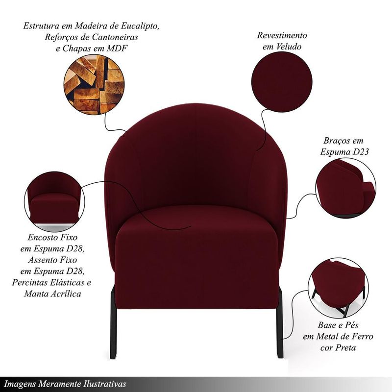 MóveisPoltronaPoltrona Decorativa Sala de Estar kenya Pés em Ferro Veludo Preto/Bordô G33 - Gran Belo