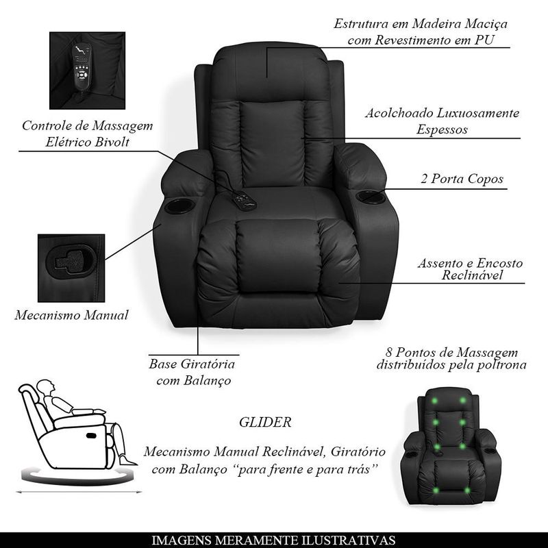 Poltrona do Papai Austin - Gran Belo é multifuncional, projetada com recursos de reclinação, balanço, massagem, aquecida e giratória. Essa poltrona é perfeita, possuindo um sistema reclinável com alavanca manual de reclinação até 160º, chegando ao conforto ideal, possui também um sistema de aquecimento no encosto e 8 pontos de massagens distribuídos por ela, assim trazendo uma massagem corporal completa para relaxar a parte superior das costas, lombar e coxas, cada ponto pode ser operado individualmente para aliviar o estresse, lidar com tensão e esticar os músculos, fora toda a qualidade implementada em sua estrutura. Não perca mais tempo e adquira já esse produto incrível!