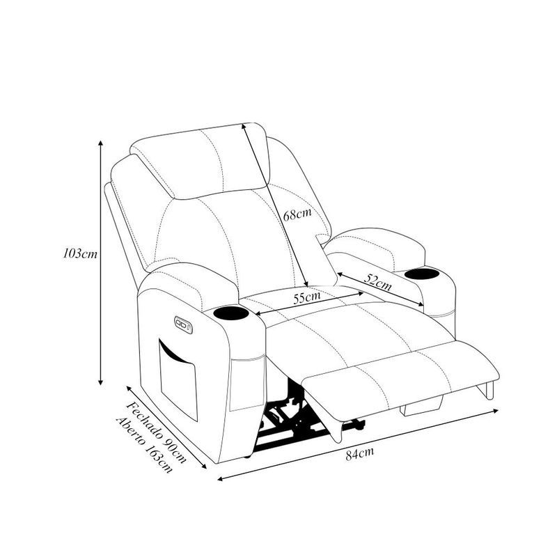 Sistema Reclinável e Retrátil: Encosto e assento com reclinação elétrica até 160° através de botão lateral com entrada USB e USB-C