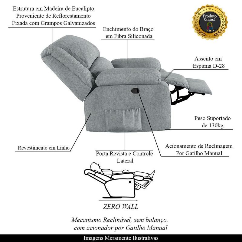 Assento/Encosto: Enchimento em Espuma D-28, com Acionamento Reclinável Elétrico por Gatilho Manual em uma das Braças
