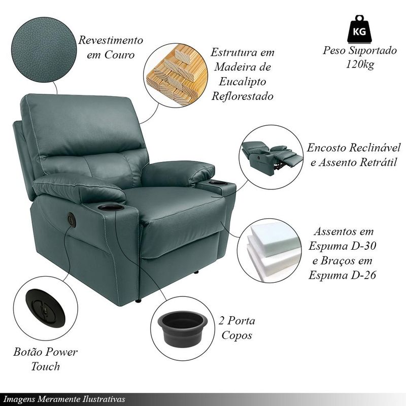 A Poltrona Mia é a escolha ideal para quem busca conforto e sofisticação com tecnologia moderna. Sua estrutura é feita em madeira de reflorestamento (eucalipto), proporcionando durabilidade e sustentabilidade. O encosto, com fibra siliconada, oferece maciez e suporte ergonômico, enquanto o assento, com espuma D-30, é perfeito para relaxar. Os braços, com espuma D-26, e os pés em metal complementam o design robusto e elegante da Poltrona Mia. Revestida em couro, ela combina luxo e praticidade, sendo fácil de limpar e manter no dia a dia. O grande diferencial da Poltrona Mia é o assento retrátil e o encosto reclinável, controlados pelo moderno botão Power Touch, permitindo ajustes precisos para o seu conforto. Com dois porta-copos integrados, é ideal para momentos de descanso ou entretenimento. Bivolt, ela se adapta a qualquer ambiente, tornando-se uma peça indispensável para quem deseja relaxar com estilo e funcionalidade. Dimensões do Produto:
