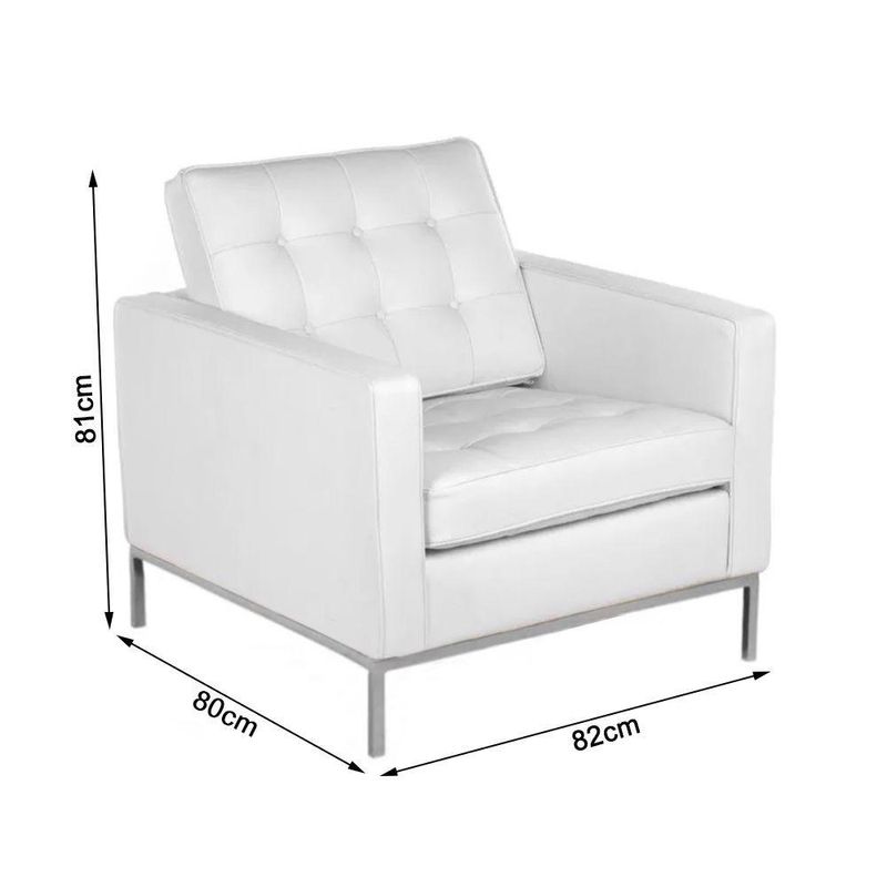 A Poltrona Florence Knoll é perfeita para qualquer tipo de ambiente, trazendo um estilo clássico e moderno, com material de qualidade e resistente, além de proporcionar total conforto. Seu design com linhas retas deixa o visual elegante e versátil, adaptando-se facilmente a diferentes estilos de decoração e tornando-se uma ótima opção para salas de estar, escritórios ou recepções.CaracterísticasTipo: PoltronaModelo: Florence KnollCor da Poltrona: BrancoCor da Base: CromadoRevestimento em Couro NaturalDimensões do ProdutoAltura: 81cmLargura: 82cmComprimento: 80cmAvisos!Limpar com pano macio e levemente umedecido, evitando produtos químicos ou abrasivos. Para maior durabilidade, não expor diretamente ao sol ou umidade excessiva.ATENÇÃOAS IMAGENS SÃO MERAMENTE ILUSTRATIVAS E PODEM SOFRER VARIAÇÕES DE COR E PEQUENOS DETALHES DE ACORDO COM O SEU MONITOR, ILUMINAÇÃO DO AMBIENTE E ATÉ MESMO A SUA PERCEPÇÃO VISUAL.Poltrona Florence Knoll Cromado em Couro Natural Branco