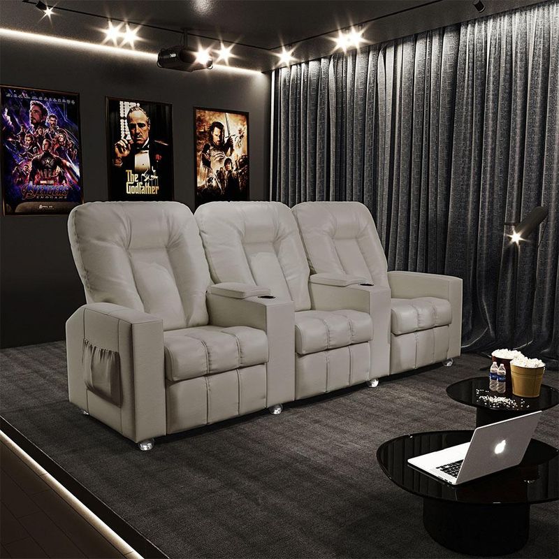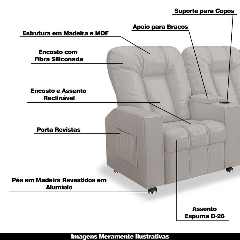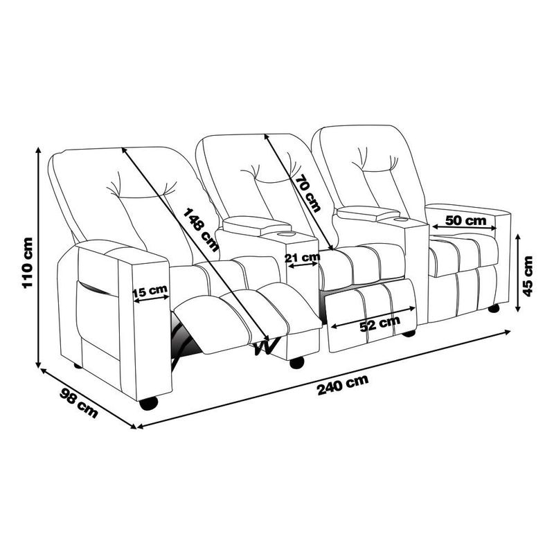 Poltrona Sala de Cinema Pequim 3 Lugares - Gran Belo é o que falta para que sua sala se torne um verdadeiro cinema. Possuindo mecanismo de 2 estágios e 3 posições, a poltrona Pequim é produzida para dar maior flexibilidade e resistência, são usadas percintas elásticas em sua estrutura, obtendo uma durabilidade maior, e tudo isso sem abrir mão do conforto. Adquira já! Dimensões do Produto: Largura: 240cm Altura: 110cm Profundidade: 98cm Profundidade Aberto: 148cm Altura do Assento: 45cm Altura do Encosto: 70cm Profundidade do Assento: 50cm Largura do Assento: 52cm Largura dos Braços: Canto 15cm, meio 21cm Características do Produto: Material da Estrutura: Madeira de Reflorestamento de Eucalipto Encosto: Fibra Siliconada e Percinta Elástica Assento: Espuma D-26 Soft e Percinta Elástica Braço: Enchimento em Espuma D-20 Sistemas: Reclinável com Mecanismo Independente de 02 Estágios e 03 Posições. Posição 01 (Sentado), Posição 02 (Leitura) e Posição 03 (Descanso) Sistema de Abertura: Com as Mãos nas Braças, Flexionar o Corpo para Trás e Mãos para Frente. Detalhes: Porta Copo Embutido nos Braços Centrais e Revisteiro Lateral nas Braças Material dos Pés: Madeira Revestidos em Alumínio Cromados Revestimento: PU Quantidade de Pés: 8 Tipo de Pés: Fixo Peso Suportado: 110 Kg por Assento; Conteúdo da Embalagem: 1 Poltrona 3 Lugares Necessita de Montagem: Não Instruções/Cuidado: Utilizar um pano levemente umedecido com água, seguido de pano seco. Evitar exposição ao sol, para que o produto não sofra alterações na cor. Não limpar com escovas ou produtos abrasivos. Observações importantes: - As imagens são meramente ilustrativas e não acompanham objetos de decoração e eletros. - Pode haver alguma diferença de tonalidade entre a imagem e o produto, por conta do tratamento de imagens e a calibração de cores da sua tela. - Todos os nossos produtos são enviados devidamente embalados e com total segurança. - Ao receber o produto o cliente deve verificar as condições da embalagem, havendo alguma avaria não assine o comprovante de recebimento, entre em contato com a loja para orientações. - A nossa loja se responsabilizará pela entrega dos produtos adquiridos até a porta de entrada ou portaria do endereço indicado. - Não nos responsabilizamos, no ato da entrega, por montagens, desmontagens e instalações de produtos, bem como, por subir ou descer escadas/elevadores ou pela utilização de guinchos ou equipamentos similares para acesso a pisos superiores em apartamentos, casas ou escritórios. Estas despesas adicionais serão de responsabilidade do cliente. - Confira as dimensões do produto no momento da compra e certifique-se de que passará normalmente por elevadores, portas, escadas e/ou corredores, evitando assim futuros desagrados ou imprevistos com a entrega do produto.