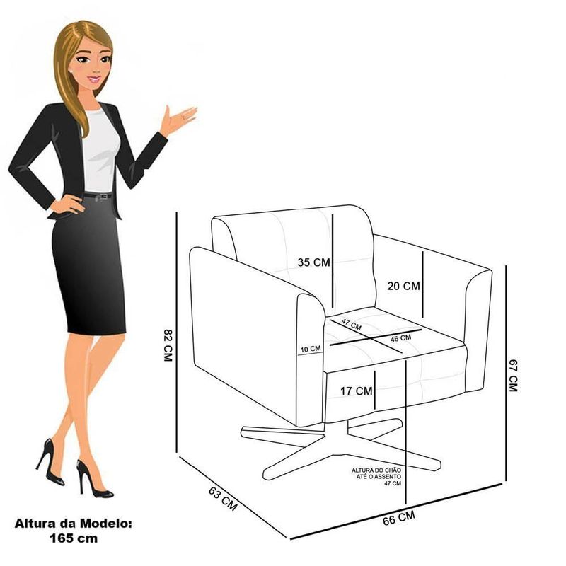 A Poltrona Elisa revestida em Sintético PU é adequada para quem busca um ambiente refinado e funcional. Seu design destaca a estrutura em madeira de eucalipto, reconhecida pela resistência e durabilidade, aliada à espuma D-26 que garante aconchego equilibrado no uso diário. O revestimento é realçado pela costura em formato quadriculado e pelo detalhe em matelassê, que conferem acabamento refinado e contemporâneo. A base giratória em aço cromada realça o estilo do produto e oferece liberdade de movimento, garantindo praticidade no dia a dia. Com encosto e assento fixos, a Elisa proporciona sustentação firme e ergonomia perfeita para longas conversas à mesa. Suporta até 120 kg, sendo ideal para uso residencial ou corporativo. Cada detalhe foi pensado para combinar charme e funcionalidade em um único móvel. Dimensões do Produto: Altura Total: 81 cm Largura Total: 64 cm Profundidade Total: 64 cm Altura do Encosto: 36 cm Largura do Assento: 47 cm Profundidade do Assento: 48 cm Altura do chão ao Assento: 45 cm Espessura do Assento: 18 cm Altura total dos pés: 27 cm Altura do chão ao braço: 66 cm Altura interna do braço: 20 cm Espessura do braço: 9 cm Peso: 20 kg Especificações do Produto: Estrutura: Madeira de Eucalipto Material do Estofamento: Assento Espuma D-26 (alta densidade) Braço e encosto D-23 Revestimento: Sintético PUPeso Máximo Suportado: Até 120 Kg Tipo de Pés: Base Giratória Cromada Material/Acabamento dos Pés: Aço Inclui Almofada Extra: Não Tipo de Encosto: Fixo Tipo de Assento: Fixo, percintas elásticas Com Apoio de Pés: Não Com Altura Ajustável: Não É Reclinável: Não É Giratória: Sim Diferenciais: Design moderno; Costura em formato quadriculado no encosto e assento; Detalhe na costura em Matelassê. Complexidade da Montagem: Baixa Montagem: O produto vai montado, apenas parafusar a base Garantia: 90 dias contra defeito de fabricação Instruções de Limpeza: Utilizar um pano limpo e levemente úmido Quantidade de Volumes: 1 Caixa Medida das Embalagens: Caixa 1: 72 cm x 66 cm x 58 cm Peso das Embalagens: 22 kg Entrega: É feita somente até o térreo ou portaria. Confira sempre as medidas das embalagens para assegurar que o produto passe por portas e escadas do local.