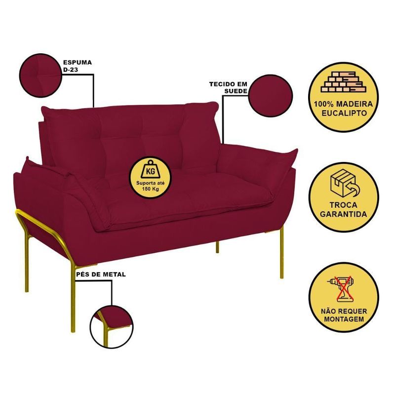 A Namoradeira Opala é a escolha perfeita para quem valoriza bem-estar e estilo. Seu design moderno, aliado à base de metal robusta, garante durabilidade e um toque sofisticado. As almofadas macias proporcionam conforto para momentos de descanso, enquanto o acabamento impecável transforma qualquer sala, quarto ou escritório em um espaço elegante e confortável. Ideal para quem busca praticidade sem abrir mão da beleza.Especificações do produto- Tecido em suede- Estrutura: Madeira 100% de eucalipto tratada, com selo de responsabilidade ambiental, percintas elásticas, grampos galvanizados e base de metal- Almofadas: 100% fibra de siliconeInformações Técnicas- Altura: 86,5 cm- Largura: 132 cm- Profundidade: 61 cm- Peso: 22 kgCapacidade de Suporte: O produto suporta até 150 kgProduto embalado- Altura: 57 cm- Largura: 134 cm- Profundidade: 63 cm- Peso: 22 kgObservações Importantes- O produto tem 3 meses de garantia contra defeitos de fabricação- Produto possui uma embalagem segura, feita para evitar danos durante o transporte- O Produto é entregue com a sua estrutura montada, apenas com a base de metal para finalizar o encaixe;- A cor real pode variar ligeiramente devido às configurações da tela e ao tratamento das imagens- O Prazo de envio é de 5 dias úteis após a confirmação da compra e enviamos para todo o BrasilNão nos responsabilzamos por subida de escada no ato da entregaPerguntas FrequentesComo devo limpar?-Realizar a limpeza do tecido com um pano seco ou levemente umedecidoQuantos produtos irei receber nesta compra?-Você receberá 1 volume, ou seja, apenas uma Poltrona Sofá Luxo Base Metal Dourado Recepção EscritórioPara mais informações ou assistência com sua compra, nossa equipe está à disposição para ajudar Tipo De Produto: Namoradeira | Desenho Do Tecido: Liso | Estilo: Moderno | Cor Dos Pés: Dourado | Unidades Por Kit: 1 | Altura: 86,5 cm | Marca: Balaqui Decor | Tipo de Garantia: Garantia do Fabricante | Coleção de Antiguidade: Não | Móvel Dobrável: Não | Dimensão (A x L x C): 86,5 x 132 x 61 | Estofado: Suede | Número de Assentos: 2 | Duração da Garantia: 3 meses | Largura: 132 cm | País de Origem: Brasil | Profundidade: 61 cm | Peso do Item (itemWeight): 22 kg | Material: Madeira | Fabricante: Balaqui Estofados | Montagem: Montagem completa | Peso Suportado: 150 kg Cor: Marsala