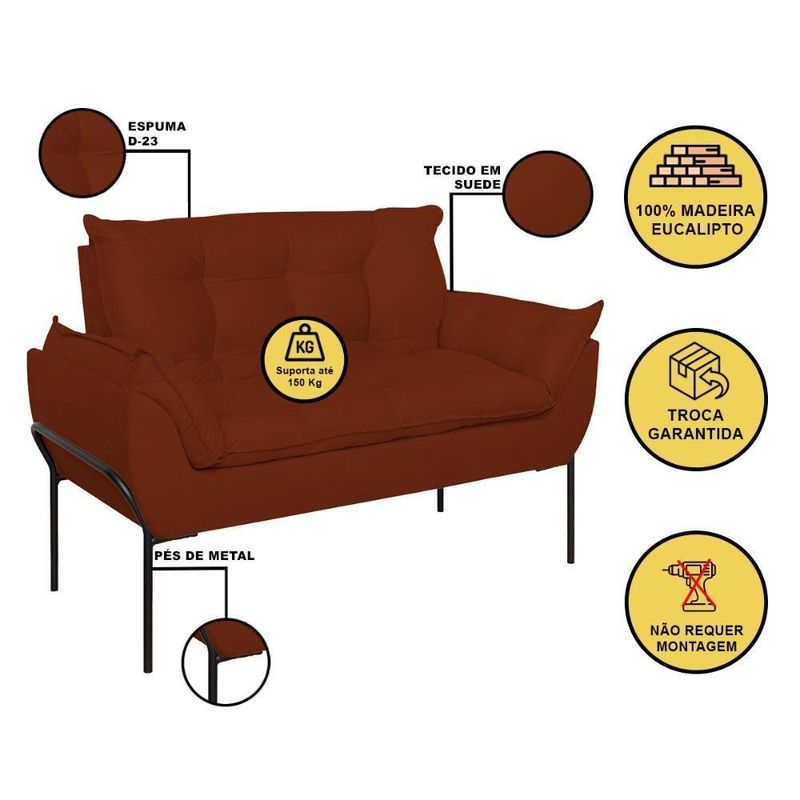 A Namoradeira Opala é a escolha perfeita para quem valoriza bem-estar e estilo. Seu design moderno, aliado à base de metal robusta, garante durabilidade e um toque sofisticado. As almofadas macias proporcionam conforto para momentos de descanso, enquanto o acabamento impecável transforma qualquer sala, quarto ou escritório em um espaço elegante e confortável. Ideal para quem busca praticidade sem abrir mão da beleza.Especificações do produto- Tecido em suede- Estrutura: Madeira 100% de eucalipto tratada, com selo de responsabilidade ambiental, percintas elásticas, grampos galvanizados e base de metal- Almofadas: 100% fibra de siliconeInformações Técnicas- Altura: 86,5 cm- Largura: 132 cm- Profundidade: 61 cm- Peso: 22 kgCapacidade de Suporte: O produto suporta até 150 kgProduto embalado- Altura: 57 cm- Largura: 134 cm- Profundidade: 63 cm- Peso: 22 kgObservações Importantes- O produto tem 3 meses de garantia contra defeitos de fabricação- Produto possui uma embalagem segura, feita para evitar danos durante o transporte- O Produto é entregue com a sua estrutura montada, apenas com a base de metal para finalizar o encaixe;- A cor real pode variar ligeiramente devido às configurações da tela e ao tratamento das imagens- O Prazo de envio é de 5 dias úteis após a confirmação da compra e enviamos para todo o BrasilNão nos responsabilzamos por subida de escada no ato da entregaPerguntas FrequentesComo devo limpar?-Realizar a limpeza do tecido com um pano seco ou levemente umedecidoQuantos produtos irei receber nesta compra?-Você receberá 1 volume, ou seja, apenas uma Poltrona Sofá Luxo Base Metal Preto Recepção EscritórioPara mais informações ou assistência com sua compra, nossa equipe está à disposição para ajudar Tipo De Produto: Namoradeira | Desenho Do Tecido: Liso | Estilo: Moderno | Cor Dos Pés: Preto | Unidades Por Kit: 1 | Altura: 86,5 cm | Marca: Balaqui Decor | Tipo de Garantia: Garantia do Fabricante | Coleção de Antiguidade: Não | Móvel Dobrável: Não | Dimensão (A x L x C): 86,5 x 132 x 61 | Estofado: Suede | Número de Assentos: 2 | Duração da Garantia: 3 meses | Largura: 132 cm | País de Origem: Brasil | Profundidade: 61 cm | Peso do Item (itemWeight): 22 kg | Material: Madeira | Fabricante: Balaqui Estofados | Montagem: Montagem completa | Peso Suportado: 150 kg Cor: Terracota