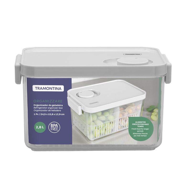 Com uma capacidade generosa, o pote organizador de geladeira Tramontina Organizzare com controle de umidade 2,8 L oferece tudo que você precisa para armazenar grandes quantidades de alimentos de maneira eficiente e organizada. Sua tampa com ventilação ajustável permite regular o fluxo de ar, garantindo o frescor prolongado de frutas, verduras, legumes e até mesmo carnes e laticínios. O design inovador inclui um cesto de drenagem, que evita o contato direto dos alimentos com a umidade, além de um divisor que facilita ainda mais a organização. A função de lembrete de data giratória ajuda a controlar o tempo de armazenamento, otimizando a sua rotina na cozinha. Seu design moderno e funcional vai transformar a organização da sua geladeira!