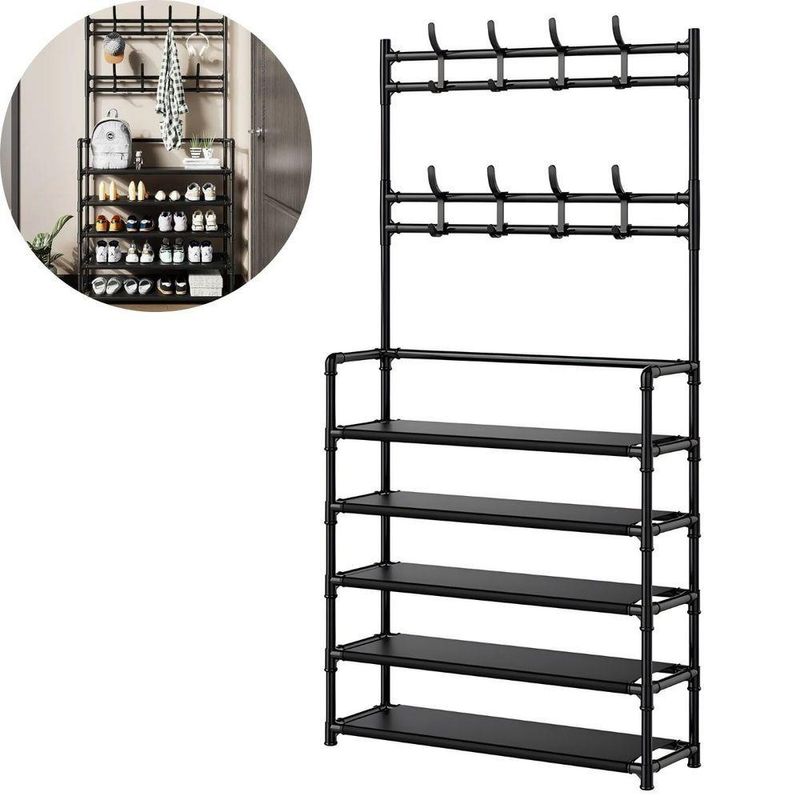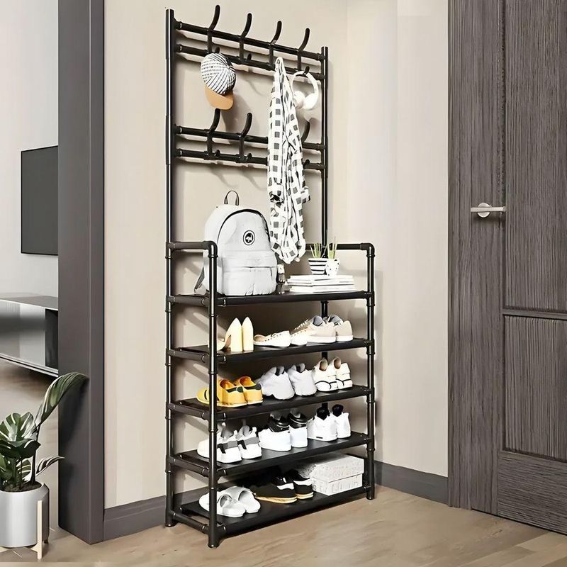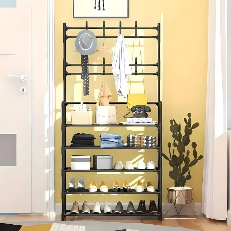 Prateleira Organizadora 5 Níveis para Calçados e Roupas - Organização e Estilo para sua CasaMantenha seu closet ou área de lavanderia sempre organizados com a Prateleira Organizadora 5 Níveis da VIFES SHOP!Esta prateleira é perfeita para armazenar e exibir seus calçados, roupas e acessórios com estilo e eficiência.Principais Características:5 Níveis de Armazenamento: Amplo espaço para organizar calçados, roupas, bolsas, casacos e livros.Ganchos Duplos: 8 ganchos adicionais para pendurar itens menores, maximizando o uso do espaço.Design Compacto e Moderno: Combina com qualquer decoração, ajudando na organização e decoração do ambiente.Fácil Montagem: Não requer ferramentas para montagem, tornando a instalação rápida e prática.Material de Qualidade: Feita de plástico PP e metal com pintura epóxi, garantindo durabilidade e resistência.Especificações do Produto:Material: Plástico PP e Metal com pintura epóxiDimensões:Altura: 172cmLargura: 60cmProfundidade: 17cmCor: PretaConteúdo da Embalagem:1 x Prateleira Organizadora 5 Níveis para Calçados e Roupas8 x Ganchos DuplosBem-vindo à VIFES SHOP!Explore nossa coleção de organizadores e transforme seu espaço com praticidade e elegância.Perguntas Frequentes:Esta prateleira é adequada para quais ambientes?A prateleira é ideal para closet, área de lavanderia, quartos e outros ambientes que necessitem de organização.Qual é o material da prateleira?A prateleira é feita com plástico PP e metal com pintura epóxi, garantindo durabilidade e resistência.A prateleira possui ganchos?Sim, a prateleira possui 8 ganchos duplos para pendurar itens menores.A prateleira é fácil de montar?Sim, a prateleira é fácil de montar e não requer ferramentas, tornando a instalação rápida e prática.Quais são as dimensões da prateleira?A prateleira tem 172cm de altura, 60cm de largura e 17cm de profundidade.Quais são as opções de cor da prateleira?A prateleira está disponível nas cores branca e preta.Adquira a Prateleira Organizadora 5 Níveis e mantenha seus espaços organizados e bonitos.Acesse nossa loja VIFES SHOP e conheça outros produtos incríveis!