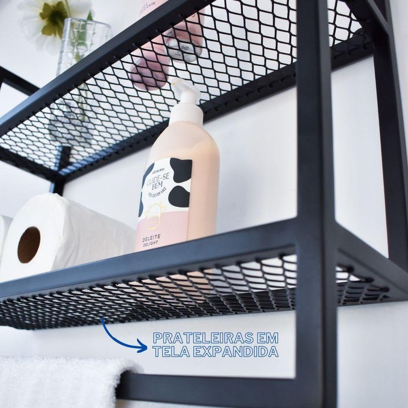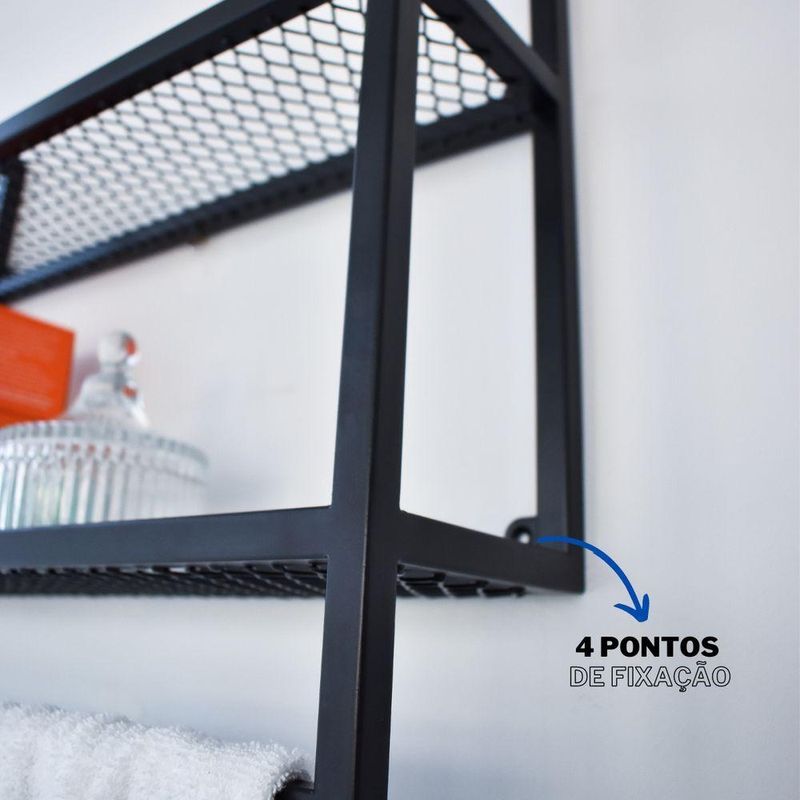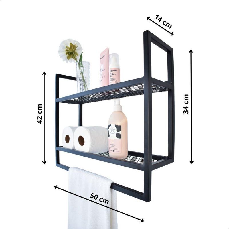 As prateleiras porta toalha Estilo Industrial da Distinto Decor Móveis são ideais para você instalar em seu banheiro, lavabo, hall de entrada, ou até mesmo na sua cozinha, deixando seu ambiente com aquele toque especial de requinte e beleza.Além da sua principal função ser um porta toalha, este item por possuir 2 prateleiras que também podem ser utilizadas como porta papel higiênico e demais objetos de decoração para o seu banheiro ou lavabo, tornando-se acima de tudo um item decorativo.A instalação é super fácil, basta você iro posicionar na parede onde pretende fixar, deixá-la no nível, fazer as marcações, furar a parede no caso de alvenaria, colocar as buchas e por fim fixá-la na parede.DIFERENCIAIS:Porque escolher esta prateleira e porta toalha?- Porque não necessita de montagem, apenas a fixação na parede.- Porque a sua estrutura é fabricada com um tubos quadrados em aço (metalon) 1,5x1,5cm, gerando maior resistência e beleza a peça.- É um produto com uma excelente resistência, pois todas as emendas possuem uma solda reforçada.- A prateleira ainda possui um acabamento incrível, pois todas emendas são vedadas, bem acabadas SEM NENHUMA marca de solda ou emendas aparentes.- A pintura é eletrostática, o que também proporciona um excelente acabamento e maior durabilidade.- As prateleiras são em tela expandidaCARACTERÍSTICAS TÉCNICAS:- Estrutura em perfil de aço (metalon) 1,5x1,5cm- Pintura eletrostática na cor preto fosco- Possui 1 porta toalha- Possui 2 prateleiras em tela expandida ;- Cada prateleira suporta até 10kg- Acompanha um kit de instalação com parafusos e buchasDimensões:Altura: 50cmLargura: 42cmProfundidade: 14cmNOTA:* Os itens das imagens são apenas decorativos. ;