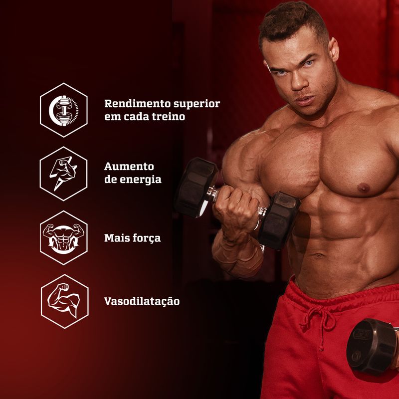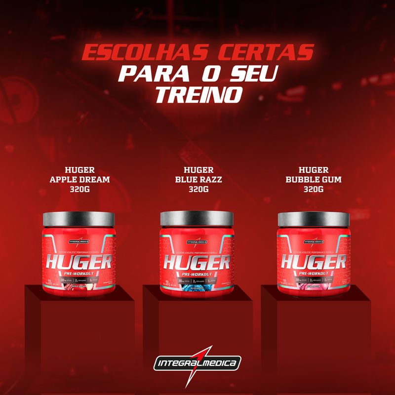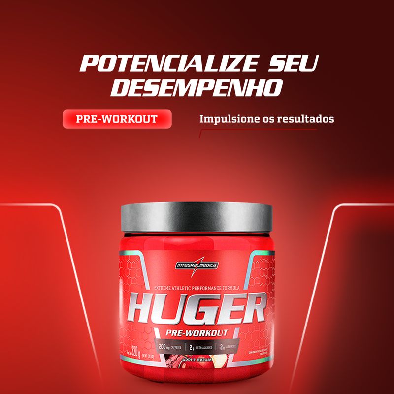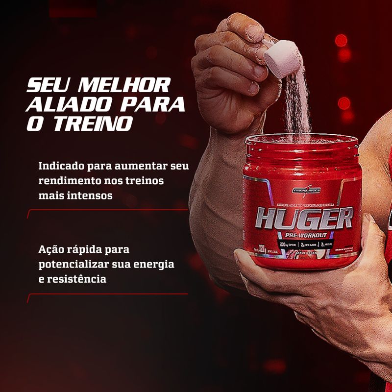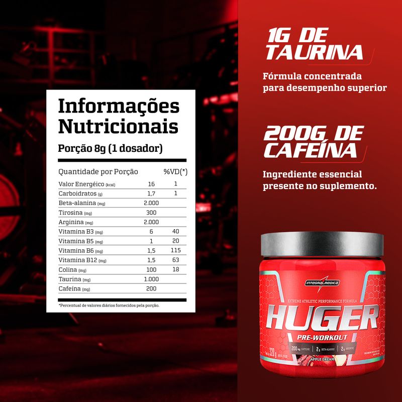 Huger é o pré-treino que tem o objetivo de te levar as maiores conquistas. Inovador e ultra concentrado te faz alcançar o maior foco e desempenho nos treinos. Sua formulação é completa e conta com ingredientes sinérgicos. BETA-ALANINA: Um aminoácido extremamente importante para melhora do desempenho, uma vez que a sua ação tamponante diminui a acidose muscular, que causa a fadiga impedindo a melhor execução dos exercícios. CAFEÍNA: É responsável pelo aumento do estado de alerta e melhora do desempenho, além de agir diretamente no músculo potencializando o aumento de força e retardo da fadiga muscular. ARGININA: Potente vasodilatador, que faz com que o recebimento de nutrientes no músculo seja aumentado, melhorando a performance e otimizando a recuperação por ser precursor de óxido nítrico (NO). TIROSINA: Precursora de dopamina que é uma das substâncias responsáveis pelo bem-estar e de foco mental, sensações importantes para o momento pré-treino. TAURINA: Atua no sistema muscular, fortalecendo o processo de contração e aumento de resistência. No sistema nervoso central atua melhorando o foco e a concentração de grandes atletas. COLINA: Grande aliada do esporte por possuir ação cerebral que confere vantagens aos atletas potencializando a concentração e aumentando a precisão de movimentos, além de ser um potente vasodilatador que maximiza o aporte de nutrientes para os tecidos.