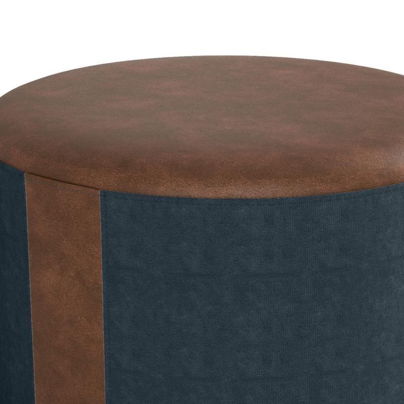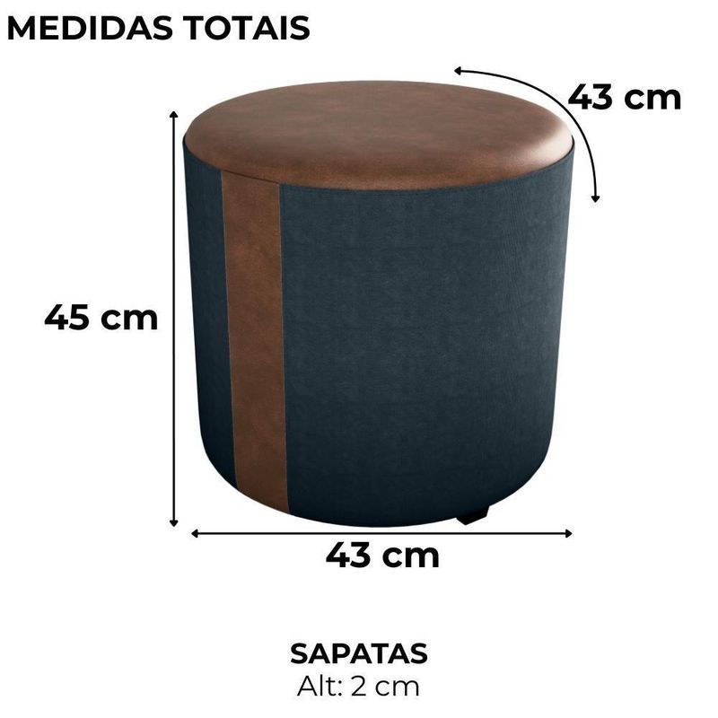 Puff Redondo Copenhage, conforto e estilo compacto! Estrutura em Madeira de Eucalipto (de reflorestamento) e MDF, estofado com espuma D20 e revestido em Veludo Light, com detalhes de costura em Corino Marrom (laterais e assento), além das sapatas plásticas (PVC) e design redondo que suporta até 110 kg. Este produto será entregue em 01 volume.