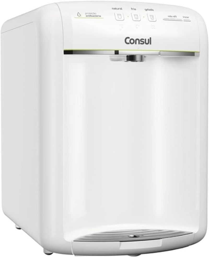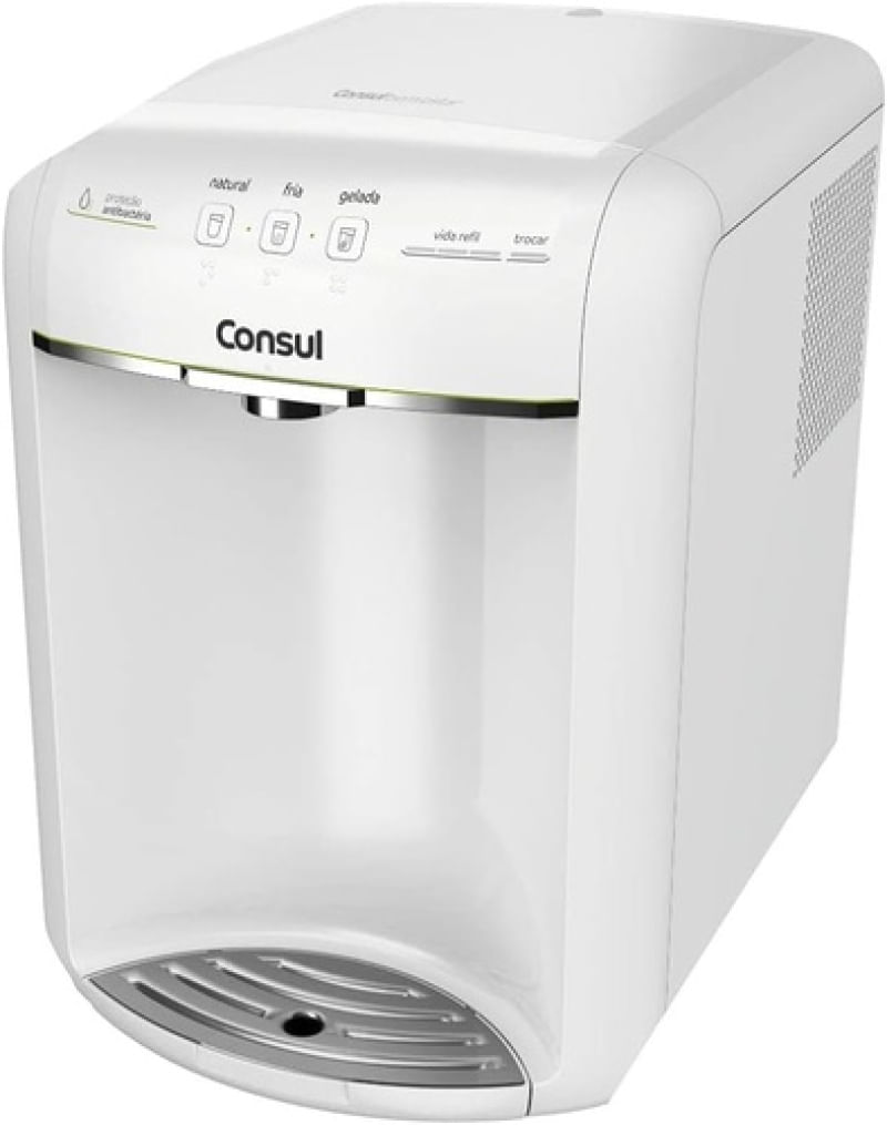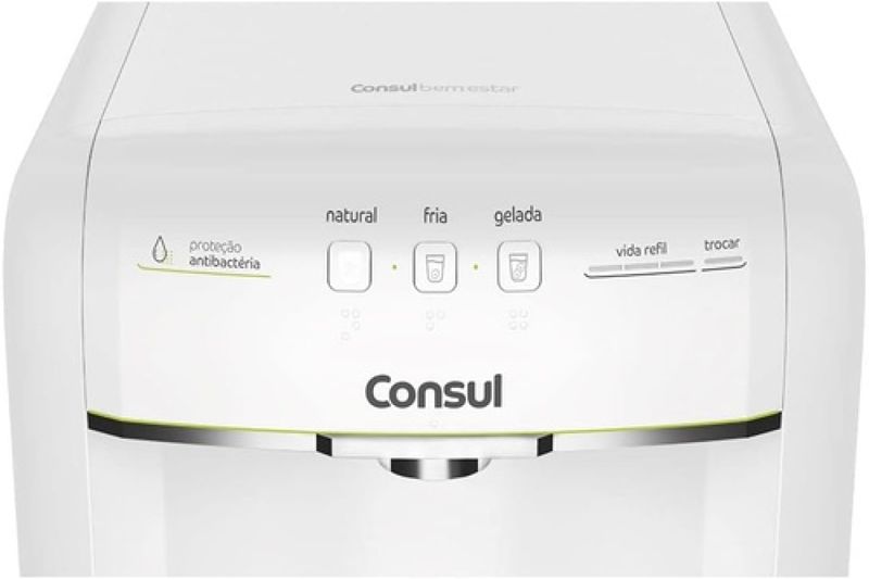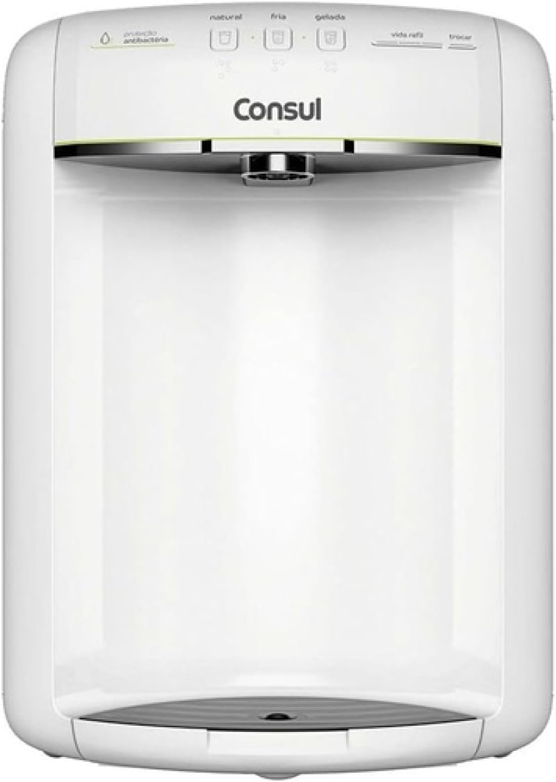 Com sistema de compressor, o Purificador de Água Consul possui uma alta capacidade de refrigeração, gelando mais água em muito menos tempo. Ter água gelada nunca foi tão fácil!Bem pensado é ter um painel funcional que te permite escolher entre três temperaturas diferentes, natural, fria ou gelada, facilitando o seu dia a dia até nas escolhas mais simples!Display gradual de vida útil do refil que te ajuda a lembrar a hora certa de troca-lo, garantindo uma água sempre pura e ideal para o consumo!Através de um filtro com eficiência bacteriológica, a Consul traz mais saúde para sua família!CaracterísticasVazão nominal: 40 - 60 L/h (litros por hora)Eficiência Bacteriológica: Com Eficiência bacteriológicaRedução de Cloro Livre: Com redução de Cloro livreRetenção de Partículas: Classe AEficiência Bacteriológica: Com Eficiência bacteriológicaPressão de funcionamento:: 0,5 barTensão:127 V (CPB36ABANA) / 220 V (CPB36ABBNA)Material de fabricação: ABS, Poliacetal, Silicone e Polipropileno.Cor: BrancoDimensões:Largura25,3 cmProfundidade33,4 cmAltura35,5 cmPeso: 12 kgGarantia: 12 mesesÁgua Gelada: Sim