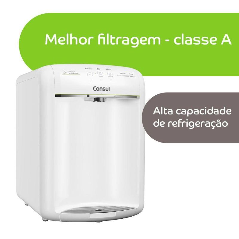 Purificador de Água Consul de Alta Capacidade de Refrigeração CPB36AB Branco 127VCom sistema de alta capacidade de refrigeração e um painel funcional, o Purificador Consul permite a seleção entre 3 níveis de temperatura – natural, fria ou gelada – além de possuir indicador gradual de vida do refil, que avisa a hora certa de trocá-lo.Diferenciais Consul:Alta Capacidade de RefrigeraçãoEquipado com sistema de compressor, gela mais água em menos tempo, garantindo praticidade para o dia a dia.3 Níveis de TemperaturaEscolha entre água natural, fria ou gelada, de forma simples e rápida pelo painel funcional.Indicador de Vida Útil do RefilDisplay gradual que mostra o momento certo da troca do refil, garantindo sempre água pura e ideal para consumo.Proteção AntibactériasFiltro com eficiência bacteriológica, oferecendo mais saúde para toda a família.Refil Troca FácilBasta girar e substituir o refil, sem complicações e sem necessidade de técnico.Especificações TécnicasCor: BrancoVoltagem: 127VRefrigeração: Água natural e geladaVazão: 40 – 60 L/hRetenção de partículas: Classe APlugue e tomada: 10 AProdutos compatíveis: W11198953; W11199342; W10301562; CJ_W11199342_2; CJ_W11199342_3; CJ_W10301562_2; CJ_W10301562_3Filtro compatível: W11198953; W11199342; W10301562; CJ_W11199342_2; CJ_W11199342_3; CJ_W10301562_2; CJ_W10301562_3Temperatura de operação: 10°C a 32°CMais informações: Possui sistema de alta capacidade de refrigeração, 3 níveis de temperatura (natural, fria e gelada) e indicador gradual da vida do refil.Dimensões e Peso AproximadosAltura: 32,8 cmLargura: 24 cmProfundidade: 29,6 cmPeso: 3,9 kgGarantia12 meses (3 meses de garantia legal + 9 meses contra defeitos de fabricação).ObservaçõesCertifique-se da montagem correta de todas as partes antes do uso.Verifique o prazo de garantia no Manual de Instruções.Em caso de problema, procure uma Assistência Técnica Autorizada.Conferir o produto no ato da entrega. Em caso de anormalidade, recuse o recebimento.Todas as informações divulgadas são de responsabilidade do fabricante, podendo sofrer alterações sem aviso prévio.Imagem meramente ilustrativa.