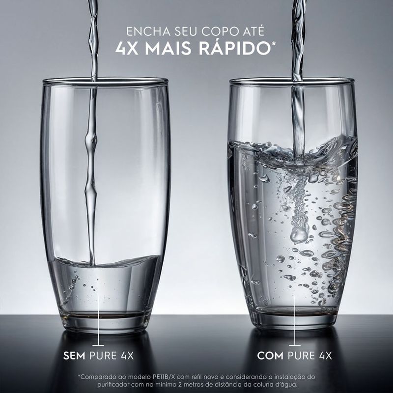 O Purificador Electrolux Eletrônico Experience com Pure 4x e Painel Digital Bivolt Preto PE12P possui tecnologia Pure 4X, potente pressurizador que enche seu copo até 4x mais rápido¹.