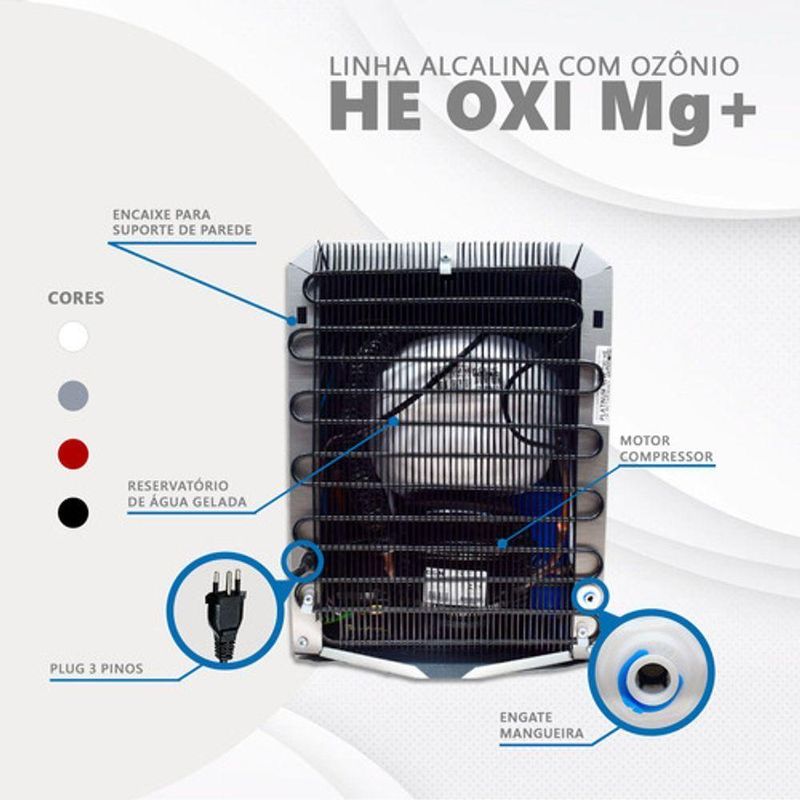 Descrição Fonte Alcalina Purificadores Você sabia que o magnésio é um mineral essencial para o funcionamento adequado do nosso organismo? Ao optar pelo nosso purificador He Oxi Mg+ (com adição extra de magnésio), você fornecerá ao seu corpo um nutriente valioso, fundamental para a saúde cardiovascular, muscular e nervosa. A água com magnésio é uma maneira simples e saborosa de complementar a ingestão diária desse mineral vital. Além de auxiliar na absorção de outros nutrientes, o magnésio tem sido associado a tais benefícios: 1. Auxilia no funcionamento muscular, 2. Auxilia no funcionamento neuromuscular, 3. Auxilia no metabolismo energético, 4. Auxilia no metabolismo de proteínas, carboidratos e gorduras, 5. Auxilia na formação de ossos e dentes, 6. Auxilia no equilíbrio dos eletrólitos, 7. Auxilia no processo de divisão celular. O purificador He Oxi Mg+ possui 3 vezes mais água magnesiana que as águas minerais comuns, trazendo mais saúde para sua vida. CARACTERÍSTICAS TÉCNICAS DO PURIFICADOR: - Capacidade de Refrigeração: 2,4 LITROS/HORA - Eficiência Bacteriológica: APROVADO - Eficiência de Retenção de Partículas: APROVADO - Eficiência de Redução de Cloro Livre: APROVADO - Refrigeração: Sim REFRIGERADO POR COMPRESSOR - Consumo de Energia: 127V (2,31kWh/Mês) - Consumo de Energia: 220V (2,28 kWh/Mês) - Tensão: 127V ou 220V - Potência: 100W - Amperagem: 0,78 A - Frequência - Mercado Nacional: 60Hz - Garantia: 1 ano - Vida Útil do Refil: 3.000 litros ou 12 meses - Uso Residencial: SIM - Uso Empresarial: SIM - Vida Útil do Produto: 10 anos (em média) - Sem Embalagem (Frente x Altura x Profundidade) CM: 29,0 x 38,6 x 39,4 - Com Embalagem (Comprimento x Largura x Altura) Cm: 43,5 x 34 x 41 - Peso Líquido: 11 kg - Peso Bruto: 12,55 kg - Gás Refrigerante: R 134 A - Vazão Máxima: 60 l/h - Grau de Proteção: IPX0 - Eficiência Energética: 127 V (0,049kW/L) - Eficiência Energética: 220 V (0,05kW/L) - Pressão de Trabalho: 0,049 Mpa a 0,39 Mpa (de 5 a 40 metros de coluna de água) CARACTERÍSTICAS TÉCNICAS DA VÁLVULA DE PRESSÃO: - Material: Injetado em ABS. - Conexão de mangueira entrada 1/4, saída de 1/4 - Cor: Branca FUNÇÃO: - Controlar de pressão do fluído (água) para evitar fenômeno golpe de aríete POR QUE DEVO COMPRAR ESSE PURIFICADOR? - Diferentemente dos demais modelos do mercado, os purificadores de água TOP LIFE não são feitos de plástico, mas sim de aço, por isso são um bem durável, capazes de resistir por pelo menos uma década de uso contínuo e diário. - O purificador HE OXI Mg+ da TOP LIFE não é apenas um filtro, ele é uma super máquina capaz de deixar a água purificada, alcalina (com adição extra de Magnésio), ionizada, refrigerada e ozonizada. - Este purificador pode trazer uma série de benefícios para saúde das famílias, sobretudo por meio da água alcalina rica em Magnésio, que auxilia no fortalecimento dos ossos, relaxamento muscular, regulação do humor e auxilia nas enzimas digestivas. - O modelo HE OXI Mg+ tem um botão que aciona o ozonizador e assim mistura na água o poderoso gás ozônio, importante agente para redução de bactérias e de resíduos de agrotóxicos na superfície de alimentos crus. - Todos os modelos de purificadores de água da TOP LIFE são aprovados pelo INMETRO (Instituto Nacional de Metrologia, Qualidade e Tecnologia), sendo assim, tem eficiência e qualidade atesta e comprovada. - Melhor relação custo-benefício do Brasil: baixo consumo de energia, maior capacidade de fornecimento de água gelada, melhor eficiência energética, redução de cloro livre, retenção de partículas e com eficiência bacteriológica aprovada. Produto altamente qualificado para seu conforto e qualidade de vida. - Menor consumo de energia elétrica seja para residência ou comércio, isso porque o motor compressor do aparelho atua com maior eficiência energética, destacando entre os mais econômicos do mercado. ITENS INCLUSOS NA EMBALAGEM: - 1x Purificador Água Alcalina Refrigerada c/ Ozônio (HE OXI Mg+) - 1x bucha T de Conexão - 1 m de Mangueira Uv - 2x Suportes de Parede - 2x Buchas - 2x Parafusos para Fixação - 1x Manual de Instrução purificador de agua top life, purificador de agua top life alcalina ozonio, purificador top life, purificador agua ozonio, purificador de agua com ozonio, purificador de agua alcalina purificador agua alcalina, filtro agua alcalina ozonio, filtro alcalinizante ozonio top life, Filtro Purificador Agua Ozonizada Alcalina Ionizada, Filtro Purificador Água Alcalina Ionizada Com Ozônio Ph 9.5, Purificador Agua Gelada Alcalino Com Ozonio Top Life, Purificador Agua Ozonizada Alcalina Ionizada Top Life, top life, purificador de agua top life, purificador de agua toplie, filtro top life, top life new oxi he health energy,