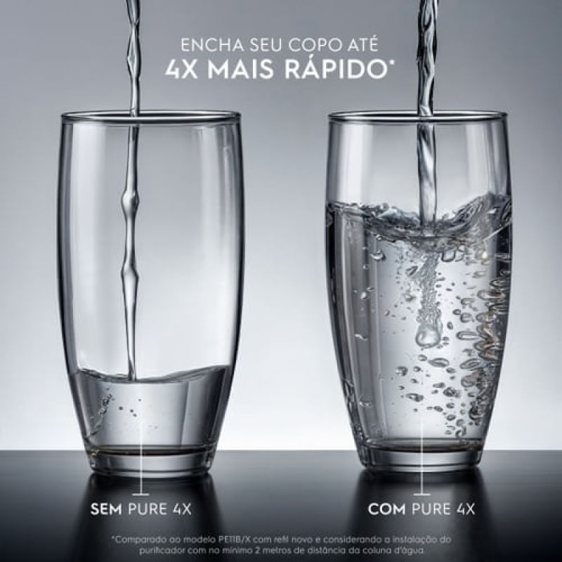O Purificador de água Pure 4x possui tecnologia Powerjet, que enche seu copo até 4x mais rápido. Esse modelo possui Tecnologia Acqua Pure: reduz cloro, odores e outras partículas presentes na sua água*. Além disso, é eficaz no controle do nível microbiológico* da sua água.