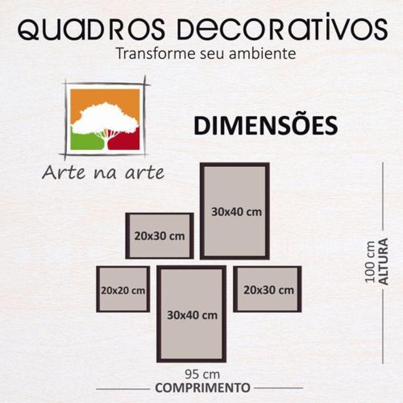 Conjunto Quadros Decorativos 5 peças Love Frase MEDIDAS - 2 Peças 20x30 - 2 Peças 30x40 - 1 Peça 20x20 MATERIAL - MDF 3mm de espessura. MOLDURA - 1cm de espessura e 2cm de largura, madeira maciça de reflorestamento, laqueada fosca como acabamento, 100% livre de imperfeições. Cantos com acabamento excelente. TIPO DE IMPRESSÃO - Impressão em alta resolução livre de imperfeições. FINALIZAÇÂO E ACABAMENTO - O quadro decorativo é finalizado com grampos e pendurador. OBSERVAÇÕES - Material liso, sem relevos; - Moldura sem vidro (Por que não vai com vidro? Como nossas imagens são impressas em material vinil brilho altamente durável, dispensa o uso do vidro. Fique tranquilo, sua imagem não corre o risco de desbotar); - Fabricação própria; - O produto pode ocorrer de ter uma leve diferença de tom na cor da que está na tela do seu computador ou celular. LIMPEZA APÓS FIXAÇÃO - A limpeza pode ser realizada apenas com um pano seco macio, se desejar pode ser úmido, porém sem conter álcool ou produtos químicos. Os quadros decorativos são muito utilizados por arquitetos e amantes da decoração. Quadros do mesmo tom, que possuam correlação e que "ornem" entre si podem ser utilizados juntos para dar uma personalização maior a um determinado ambiente. Composições podem ser utilizadas em salas, cozinhas, varandas, quartos ou qualquer ambiente que você queira deixar com a sua cara. Sendo assim a Arte na Arte criou pra você uma enorme variedade em Quadros Decorativos de cores e desenhos que seguem as últimas tendências de decoração. Transforme seu ambiente, decore sua sala, quarto, cozinha, escritório ou presenteie alguém especial com o Quadro Decorativo Arte na Arte. Esperamos que se sinta à vontade e encontre aqui o SEU estilo, e ao olhar pra o seu ambiente, seja ele qual for - possa dizer: "Agora meu ambiente está completo!" Tire todas suas dúvidas conosco, estamos sempre à disposição. Imagem ambiente criado por Freepik.