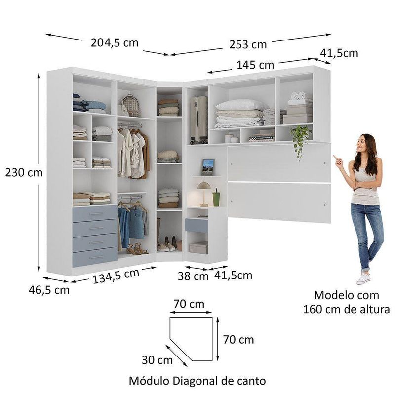 - 1 Guarda Roupa de Canto Diagonal Modulado 70cm 1 Porta Alpes Luciane Moveis 230 x 70 x 70 (Alt x Larg x Prof - cm)