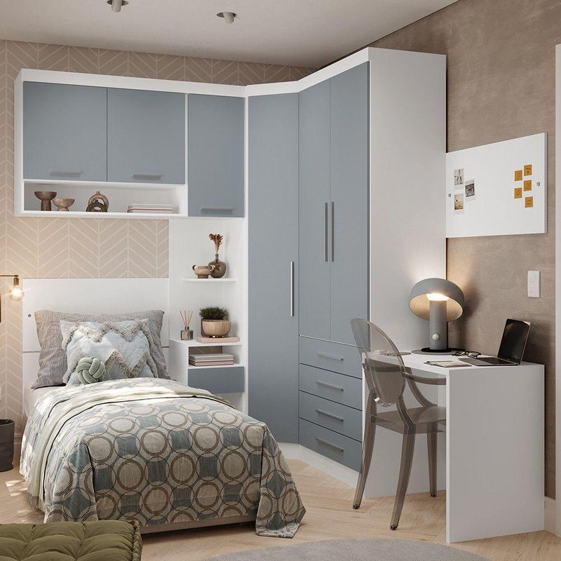 Quarto De Canto Solteiro Com Guarda Roupas Cabeceira E Escrivaninha Alpes Luciane Móveis Branco Pf Com Grey Sky Pf