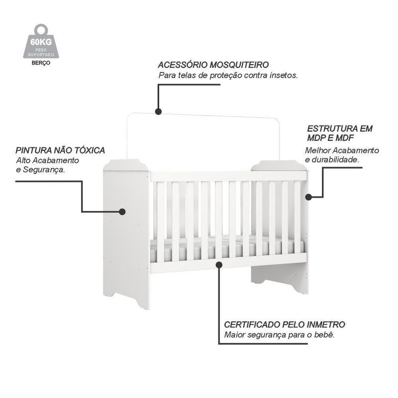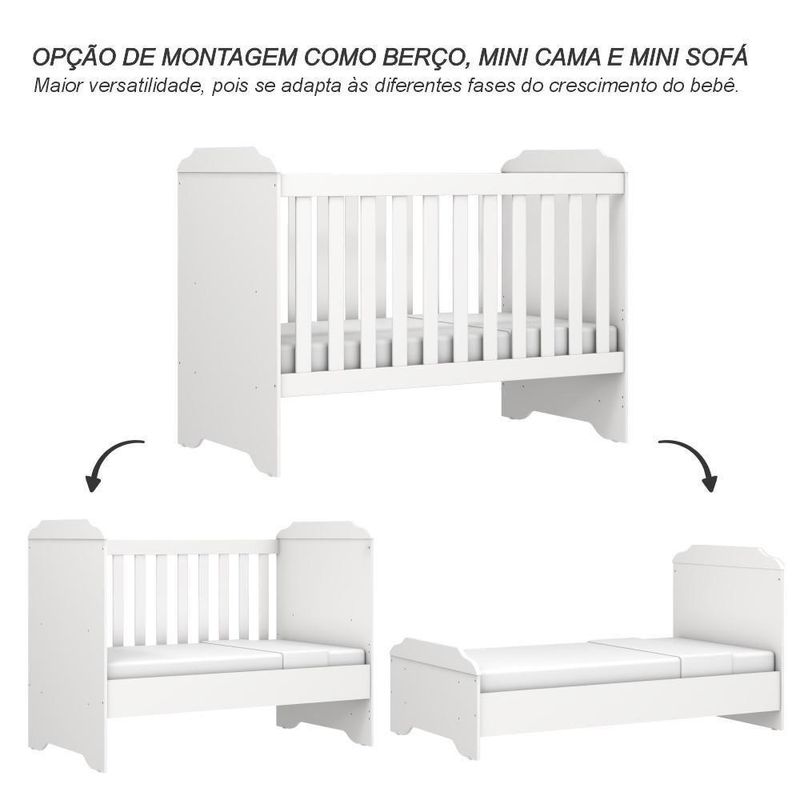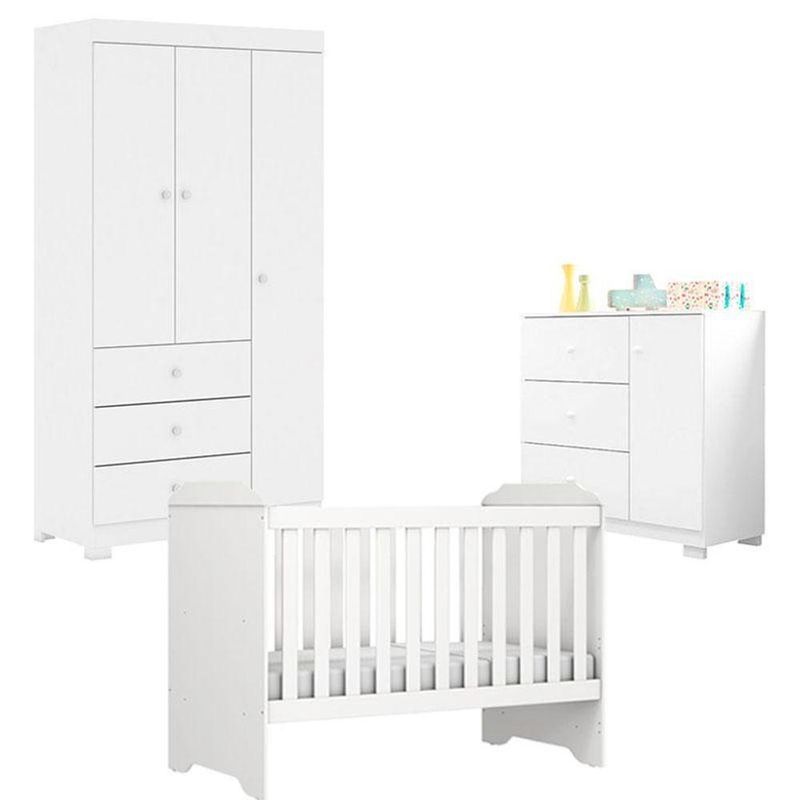 Quarto de Bebê Duda 3 Portas com Berço Americano Mini Cama Mel Branco Brilho – Phoenix BabyA mamãe começou a procurar móveis para o quartinho do seu bebê? Então apresentamos para você este belo conjunto composto pelo berço americano da linha Mel desenvolvido pela Carolina, cômoda e guarda roupa 3 portas da linha Duda desenvolvido pela Phoenix Baby. O berço pode ser utilizado futuramente como mini cama, prolongando a sua vida útil. A cômoda possui três gavetas e uma porta. Já o guarda roupa conta com três portas e três gavetas, oferecendo um amplo espaço interno para a mamãe poder acomodar as roupinhas e acessórios do seu filho. São fabricados em MDP/ MDF da mais alta qualidade, garantindo mais durabilidade e resistência. Esse conjunto irá combinar com qualquer ambiente, além de ser projetado para acompanhar todas as fases de crescimento do seu filho. Confira as características:Características Técnicas:Berço Americano Mini Cama Mel Branco Brilho - Carolina- Desenvolvido em MDP/MDF