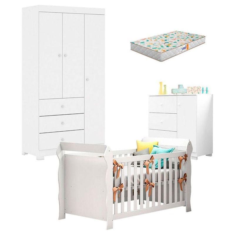 Quarto de Bebê Duda 3 Portas e Berço Americano Lara Branco Brilho com Colchão Gazin – Phoenix BabyA mamãe está montando o quartinho do seu bebê? Então apresentamos para você este belo conjunto composto pelo berço americano da linha Lara fabricado pela Carolina acompanhado do colchão Gazin, cômoda e guarda roupa 3 portas da linha Duda fabricado pela Phoenix Baby. O berço pode virar mini cama, acompanhando a fase de crescimento do seu bebê, e prolongando sua vida útil. A cômoda possui três gavetas e uma porta. Completando o conjunto, o guarda roupa conta com três portas e três gavetas. Proporcionando um ótimo espaço interno para a mamãe acomodar melhor as roupinhas e acessórios, livrando de bagunças e mantendo o ambiente organizado. Desenvolvidos em MDP/ MDF da mais alta qualidade, garante durabilidade e resistência. Sendo o conjunto ideal para acompanhar todas as fases de crescimento do seu filho. Além disso, foi cuidadosamente projetado para combinar com qualquer ambiente. Confira as características:Características Técnicas:Berço Americano Lara Branco Brilho - Carolina- Desenvolvido em MDF/MDP
