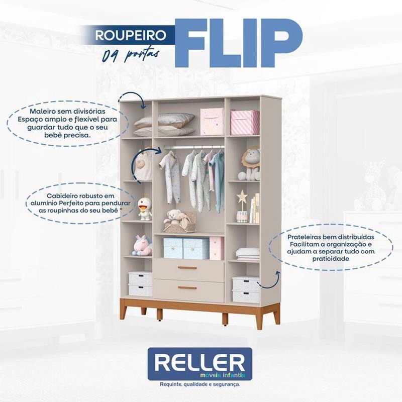 Quarto de Bebê Flip Guarda Roupa 4 Portas e Cômoda Gaveteiro Areia Acetinado - RellerO Quarto de Bebê Flip da Reller é a escolha ideal para quem busca praticidade, beleza e conforto em um só conjunto. Com design moderno o kit com Roupeiro moderno é composto por um berço e funcional, desenvolvido dentro das normas de qualidade, que garante noites tranquilas e acolhedoras. A Cômoda Gaveteiro oferece amplo espaço interno, equipada com corrediças telescópicas que proporcionam abertura suave, além de puxadores em MDF revestido e pés em madeira. Desenvolvido pela Reller com toda praticidade.Guarda Roupa Infantil Flip 4 Portas Areia Acetinado - RellerCaracterísticas Técnicas:- Desenvolvido 100% em MDF