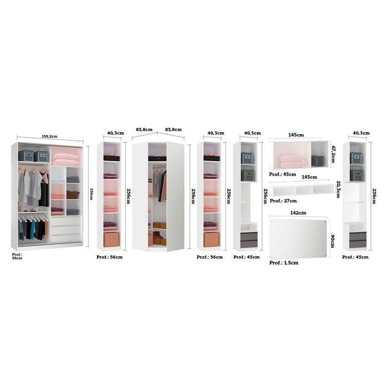 1 Guarda Roupa Modulado Canto Diagonal 1 Porta 6 Prateleiras 83cm com Espelho Prime Luciane Moveis
