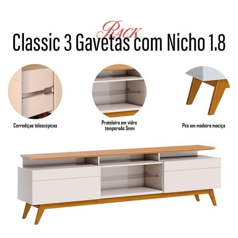 Rack Bancada Classic 2 Gavetas com Nicho 1.8 Off White Nature - ImcalO rack da linha Classic 1.8 é um móvel elegante e funcional que combina design clássico com praticidade. Desenvolvido em MDP/ MDF, é fabricado pela Imcal com materiais de alta qualidade garantindo mais durabilidade e resistência. Apresentando uma prateleira em vidro, proporciona um toque refinado permitindo que você coloque seus itens ou aparelhos eletrônicos. Além disso, possui três nichos espaçosos, ideais para acomodar seus aparelhos eletrônicos. Com duas gavetas equipadas com corrediças telescópicas, oferece espaço adicional para guardar seus acessórios. As corrediças telescópicas garantem um deslizamento suave e silencioso, tornando o acesso mais prático. Os pés em madeira maciça oferece mais estabilidade. Com suas linhas clássicas e detalhes cuidadosamente trabalhados, é a escolha perfeita para quem busca estilo, praticidade e qualidade superior. Confira e garanta o seu!Características técnicas:- Produzido em MDP/ MDF