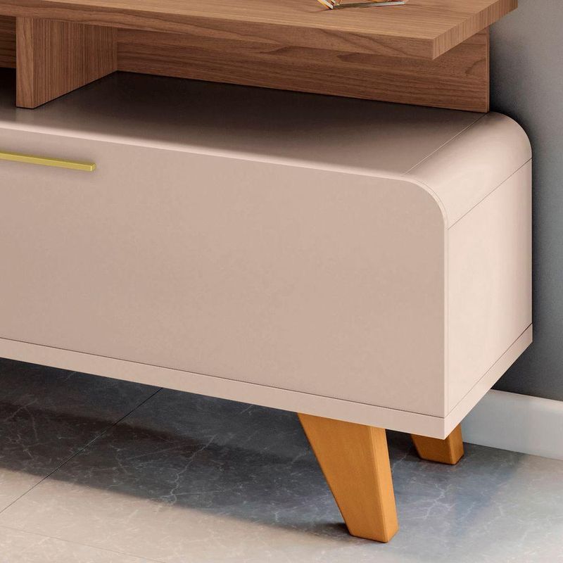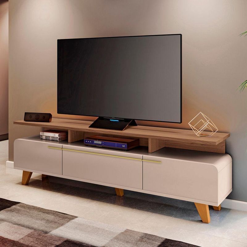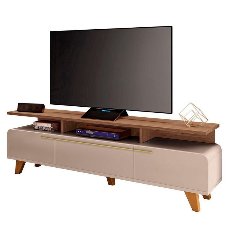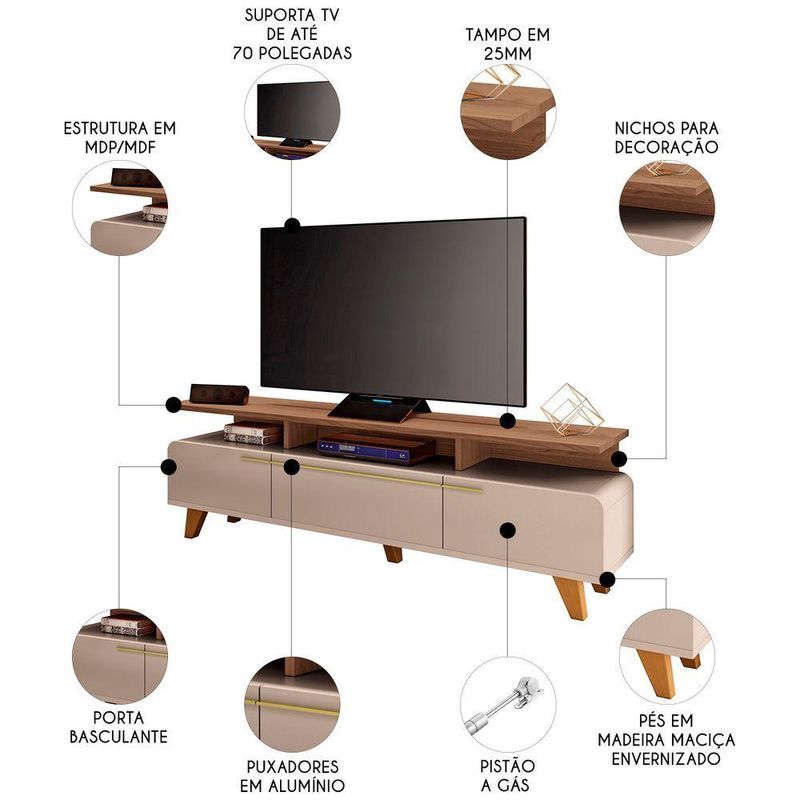 Seus cantos arredondados conferem um toque de suavidade e elegância, que é ideal para acomodar uma TV de até 70 polegadas sobre a sua base ampla e resistente, além disso abaixo do tampo conta com espaço para os eletrônicos. A Bancada Para Sala possui três portas basculantes com pistão a gás, que facilitam a abertura e o fechamento, além de garantir um espaço interno otimizado para guardar objetos e acessórios. Os puxadores metálicos em tom dourado contrastam com a cor neutra da bancada, criando um efeito visual de requinte e harmonia. Os pés de madeira maciça com acabamento envernizado proporcionam estabilidade e durabilidade ao Rack Para Sala, que é produzido em MDP e MDF de 25mm e 15mm, materiais de alta qualidade e ecologicamente corretos. Esta bancada é uma ótima opção para quem busca um móvel funcional, bonito e versátil para a sua Sala De Estar.
