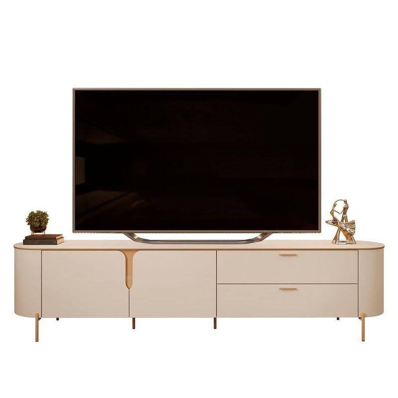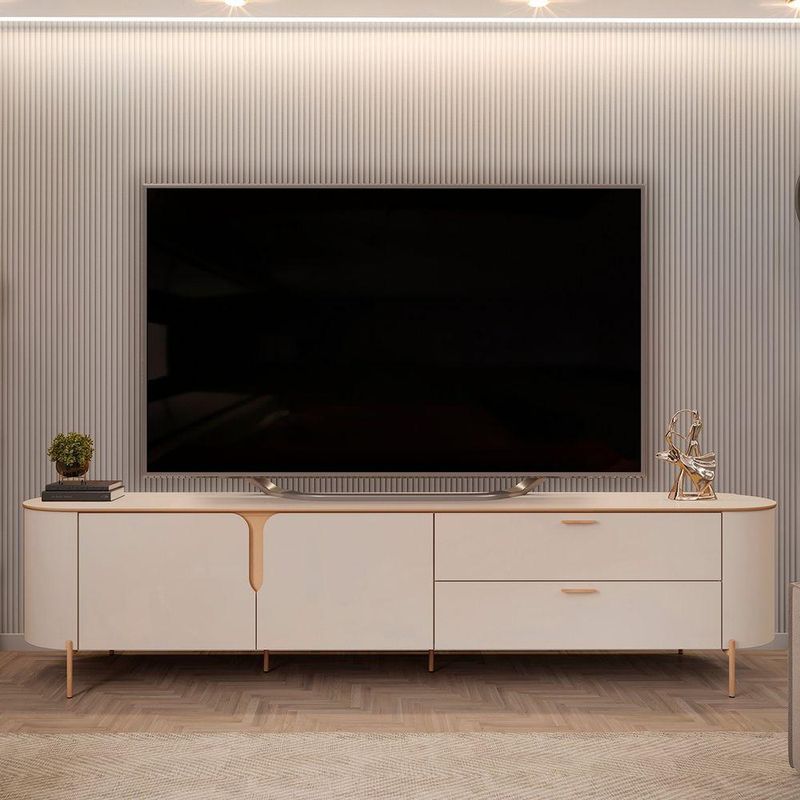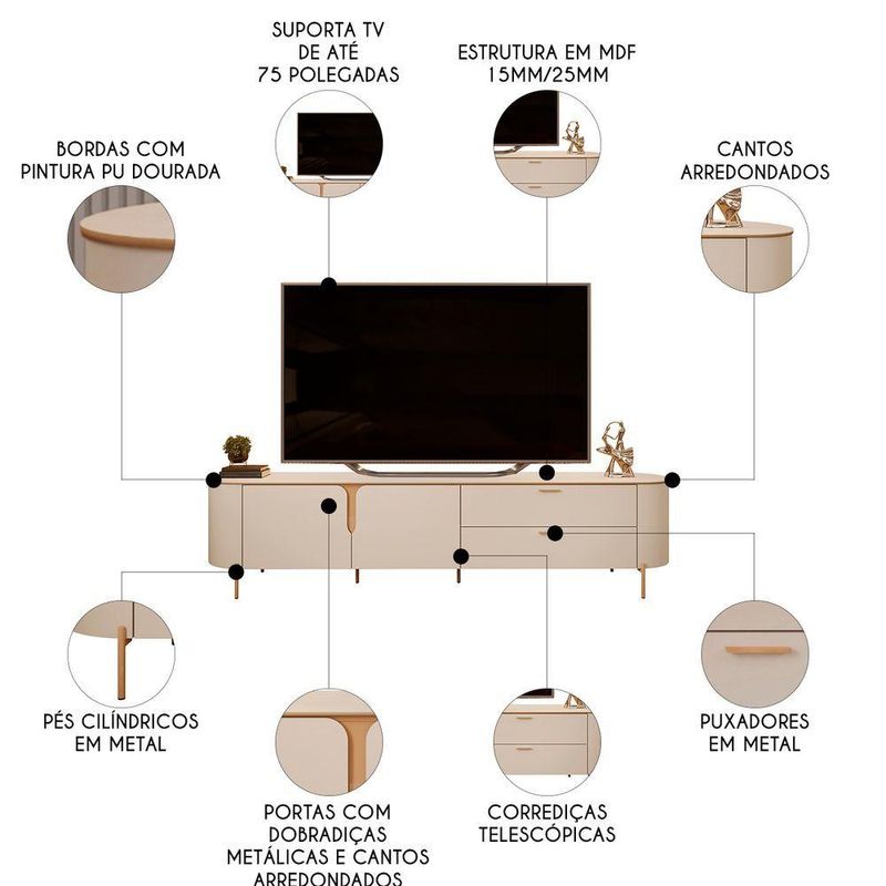 Este Rack Bancada combina elegância e funcionalidade, com laterais e tampo usinados, cantos e detalhes curvos que seguem as tendências mais atuais de design. Com duas portas convencionais com dobradiças metálicas e gavetas equipadas com puxadores estilosos, oferece amplo espaço de armazenamento. Detalhes em pintura dourada no tampo acrescentam um toque luxuoso ao móvel. A Bancada para TV também é prática para o dia a dia, com passa-fios que mantêm os cabos organizados. Seus pés metálicos cilíndricos dourados garantem durabilidade e um visual sofisticado. com TV de até 75 polegadas, é a escolha ideal para proporcionar charme e funcionalidade ao seu lar. Transforme sua Sala de Estar em um espaço mais organizado e requintado com esse móvel, que une beleza e utilidade.