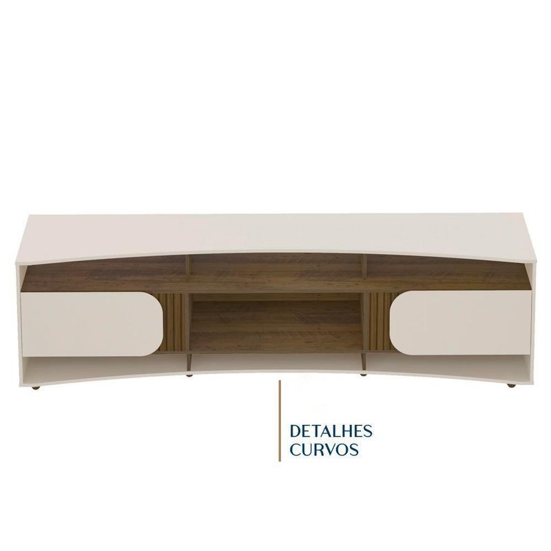 Características adicionais: Tampo suporta TV até 86 polegadas; 2 Portas com detalhes curvos e dobradiças metálicas; 7 Nichos para armazenar seus objetos; 8 pés de plástico para melhor distribuição de peso; contém 1 passa fio