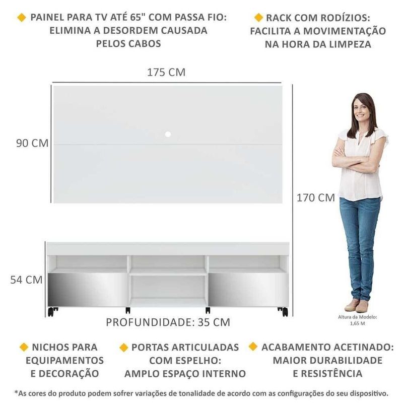 O Rack com Espelho, Rodízios e Painel 65" e 2 Portas Londres Multimóveis é produzido em MDP com acabamento acetinado, que garante maior durabilidade, possui rodízios que facilitam a movimentação na hora da limpeza, 4 nichos com espaço para os equipamentos eletrônicos e objetos decorativos, além de 2 portas articuladas com espelho e um amplo espaço interno para manter seus pertences organizados. Os espelhos de vidro (evita que a imagem fique distorcida) e lapidados, ou seja, passam por um processo para que as bordas não fiquem cortantes, o que garante maior segurança, deixam o móvel mais requintado. O painel para de até 65” (suporta até 30 Kg) possui espaçamento para passagem dos fios, que permite deixar os cabos mais organizados e o visual clean. Seu ambiente bonito e confortável para curtir os melhores filmes e séries.