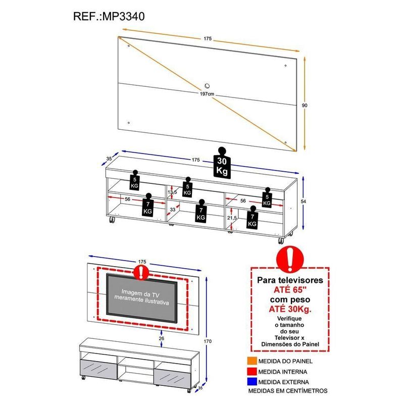 Painel - Altura: 90cm | Largura: 175cm | Profundidade: 2,5cm