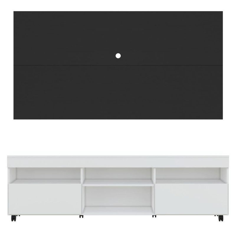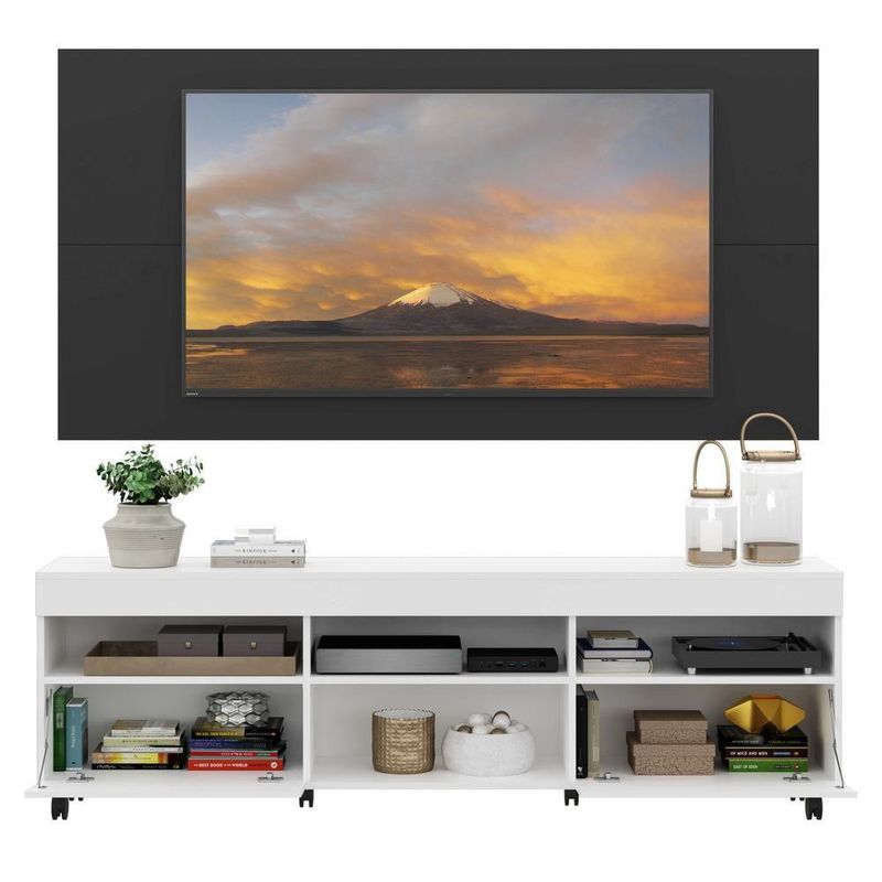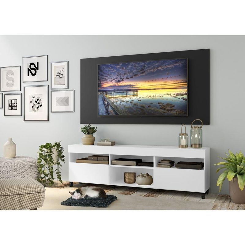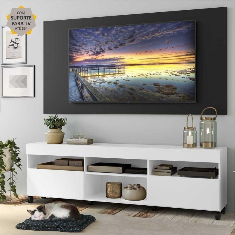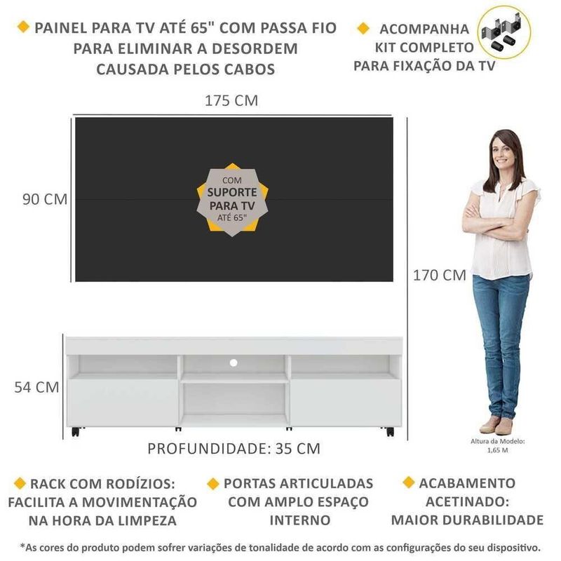 O Rack com Painel e Suporte para até 65 Polegadas com 2 portas e Rodízios Londres Multimóveis é produzido em MDP com acabamento acetinado, que garante maior durabilidade, possui rodízios que facilitam a movimentação na hora da limpeza, 4 nichos com espaço para os equipamentos eletrônicos e objetos decorativos, além de 2 portas articuladas com um amplo espaço interno para manter seus pertences organizados. O painel para de até 65” possui espaçamento para passagem dos fios, que permite deixar os cabos mais organizados e o visual clean. Para facilitar a sua vida, este produto acompanha também o kit para fixação da . Muito prático e de fácil instalação, pode ser utilizado para ’s LCD, LED e plasma de 14” a 71”. Totalmente sobreposto, acompanha gabarito de montagem que auxilia na instalação. Conta com um sistema de encaixe rápido, possui 16mm de deslocamento que permite o ajuste do encaixe das peças. Uma ótima opção para deixar sua sala linda e confortável para curtir os melhores filmes e séries.