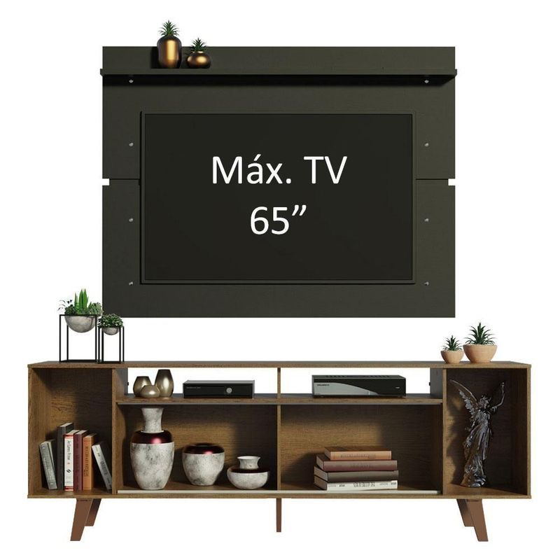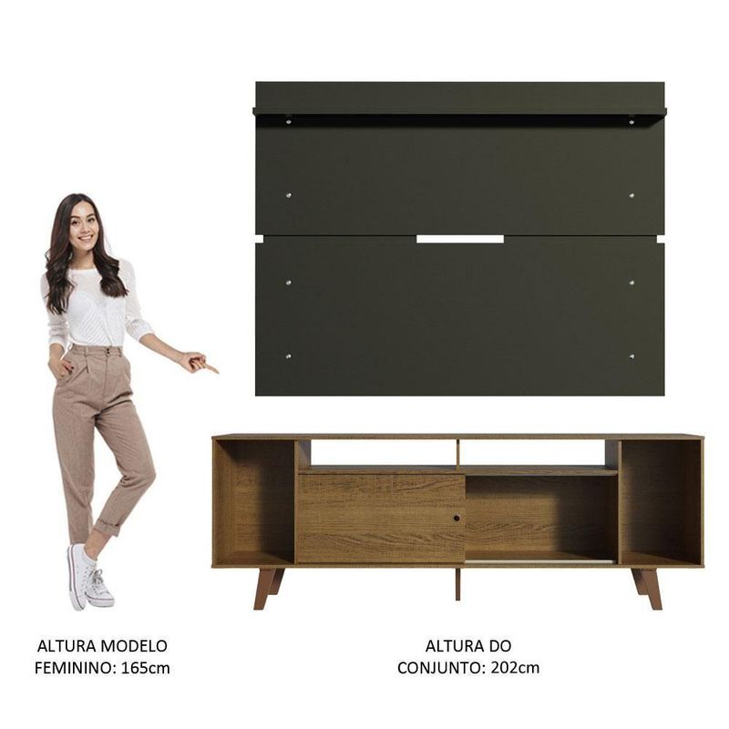 O painel comporta de até 65 polegadas e conta com abertura para passar os fios. Contempla também uma prateleira na parte superior, perfeita para objetos decorativos. Por ser separado do rack, pode ser fixado na altura desejada. O acabamento do rack é no padrão amadeirado Rustic e o painel é preto. É feito em Poliéster Protetor com 7 camadas, detalhe que confere mais durabilidade e qualidade aos produtos. Além disso, é ecológico, isento de vapores prejudiciais à atmosfera.