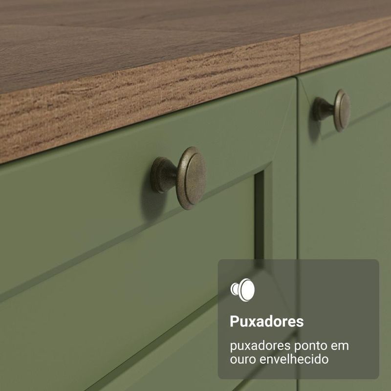 O acabamento de alta resistência da estrutura é no tom amadeirado Rustic, das frentes em Verde e possui uma textura suave ao toque. O destaque fica por conta dos puxadores ponto em ouro envelhecido, feitos com metal resistente, trazem personalidade e um charme único. O detalhe chanfrado das frentes forma molduras delicadas e atemporais, no estilo americano.