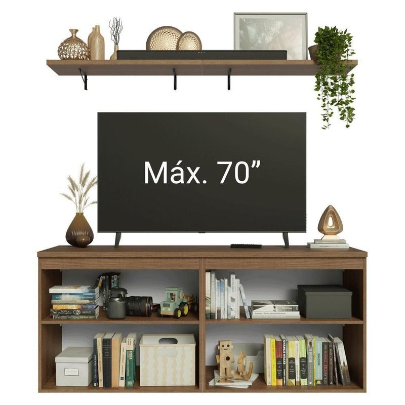 O conjunto é composto por um rack com quatro portas, complementado por prateleiras suspensas que proporcionam espaço extra para decoração e organização. As portas contam com dobradiças com amortecimento, garantindo um fechamento suave e silencioso. Além disso, o rack oferece amplo espaço interno para armazenar equipamentos eletrônicos e outros itens, mantendo a sala sempre em ordem.