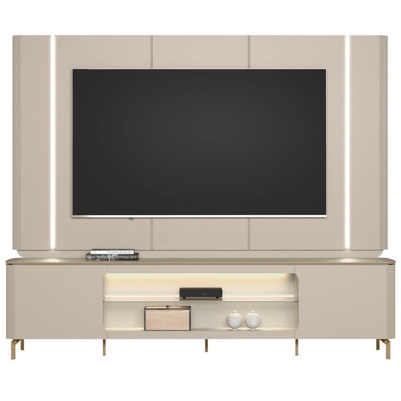 O painel para TV, com seus detalhes curvos canelados, suporta TVs de até 85 polegadas. Já o rack bancada, com tampo em MDF e pés metálicos dourados que evocam o charme industrial, complementa a elegância do ambiente. Os nichos centrais com LED, além de embelezar com um toque único, também são ideais para organizar aparelhos eletrônicos e itens decorativos, enquanto as fitas de LED nas laterais do painel adicionam um toque mágico à sua sala, criando um espaço acolhedor para momentos especiais.