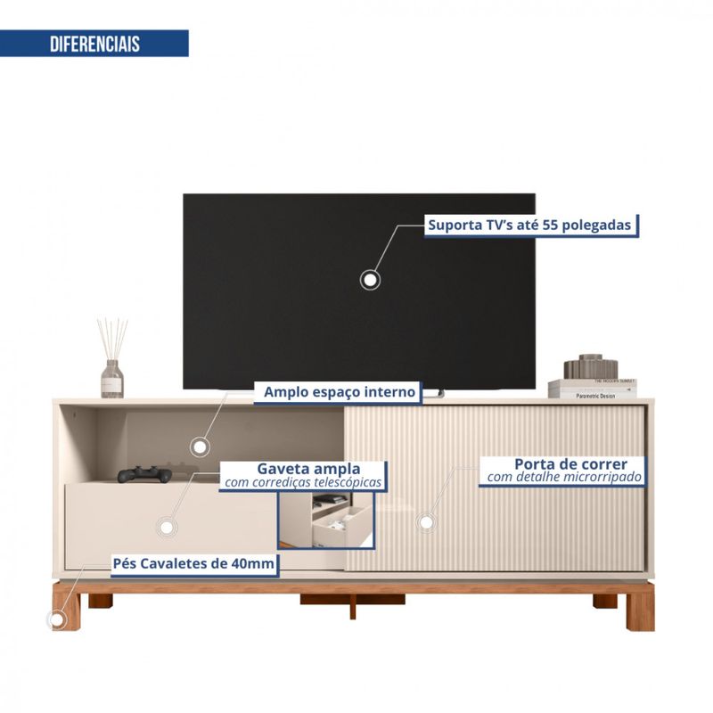 amplo espaço para acomodar sua TV de até 55 polegadas e outros eletrônicos. A gaveta proporciona organização e a porta de correr
