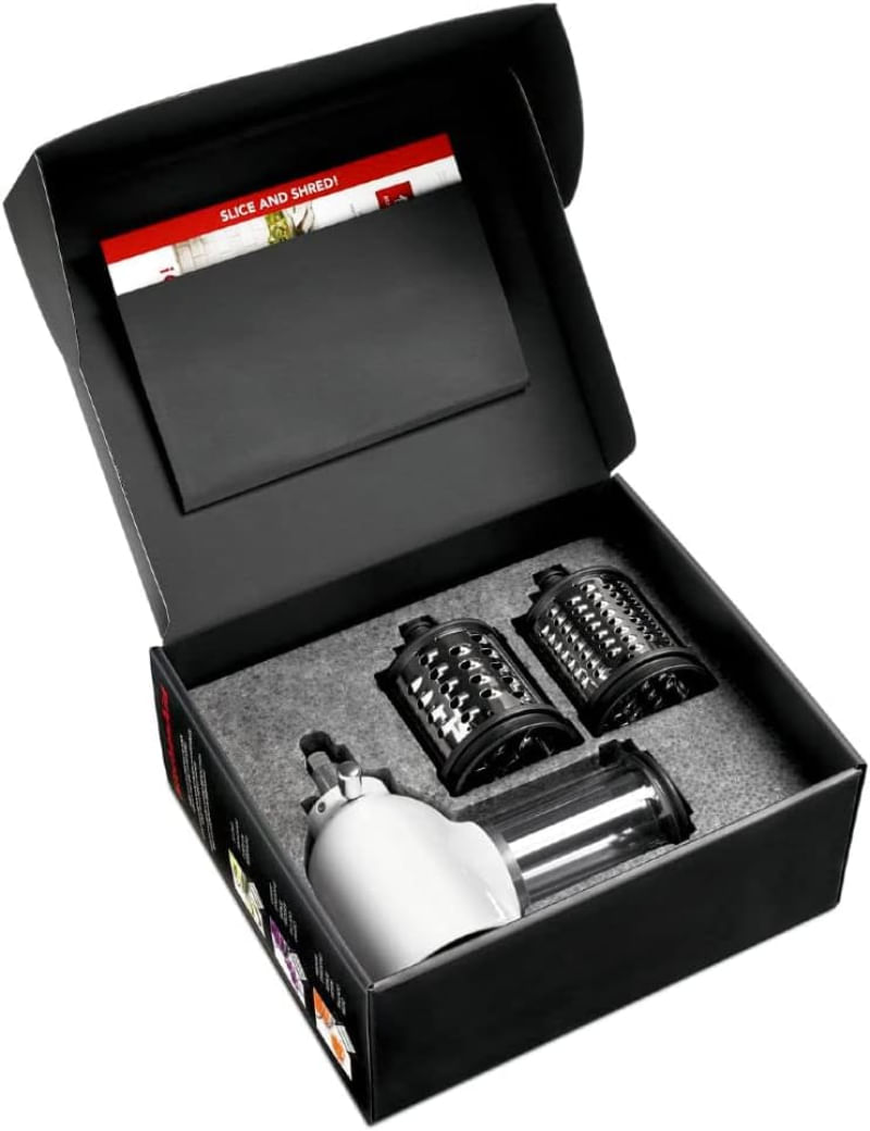 Possui 3 lâminas diferentes, para serem utilizadas de acordo com o corte que desejar, além de se adaptar a todas as batedeiras KitchenAid e a diferentes tamanhos de bowls. Fácil e rápido de usar, possui empurrador de alimentos 2 em 1, ideal para frutas e vegetais de diferentes diâmetros.